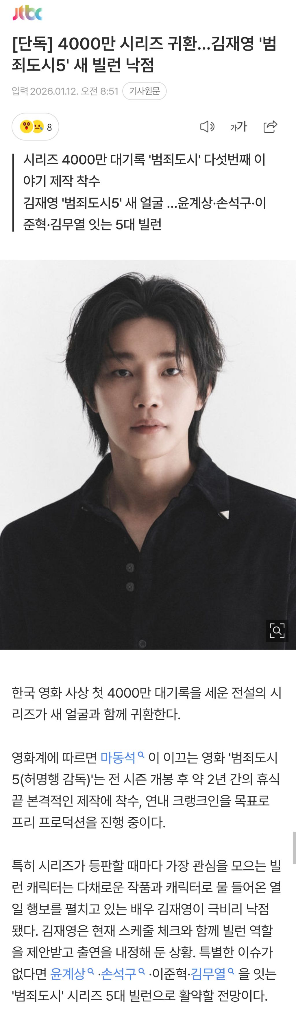 도탁스 (DOTAX) [[뉴스]][단독] 4000만 시리즈 귀환…김재영 '범죄도시5' 새 빌런 낙점 작성시간26.01.12|조회수24,918 목록 댓글 26 글자크기 작게가 글자크기 크게가 https://m.entertain.naver.com/home/article/437/0000473004[단독] 4000만 시리즈 귀환…김재영 '범죄도시5' 새 빌런 낙점여기를 눌러 링크를 확인하세요m.entertain.naver.com 다음검색 현재 게시글 추가 기능 열기 북마크 공유하기 신고 센터로 신고 댓글 26 댓글 리스트 작성시간 26.01.12 지옥에서 온 판사 그 친구네 작성시간 26.01.12 감독 최신 연출작이 북극성 ㅋㅋㅋㅋㅋㅋㅋ 할말하않 작성시간 26.01.12 2까지가 선녀 작성시간 26.01.12 왕발형사 한다온 작성시간 26.01.14 아는 맛이 맛있다구! 카페 방문해 더 많은 댓글 만나기!