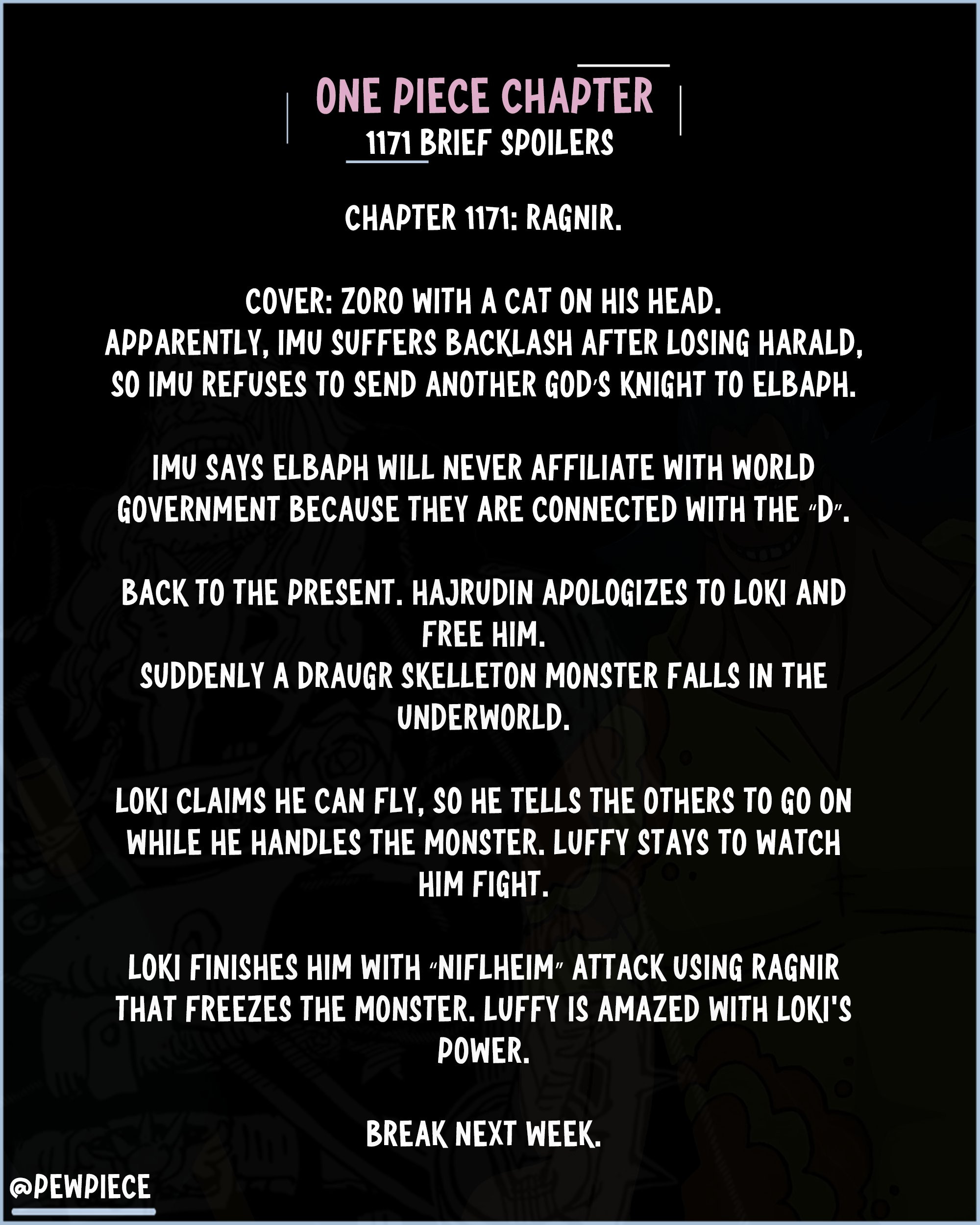 현재 시점으로 돌아와서, 하이루딘은 로키에게 사과하고 그를 풀어준다. 그때 갑자기 언더월드(저승)로 드라우그 해골 몬스터가 떨어진다. 로키는 자신이 날 수 있다고 말하며, 몬스터는 자신이 처리할 테니 다른 사람들은 먼저 가라고 한다. 루피는 남아서 그의 싸움을 지켜본다.