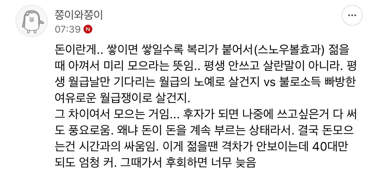 작성시간 26.01.17 나중에 쓰고 싶은거 다써도 풍요롭다고?? 나랑 다른세계 사람인가 요즘 결혼하고 집사고 애키우고 하면 풍요로울수가 있나??
