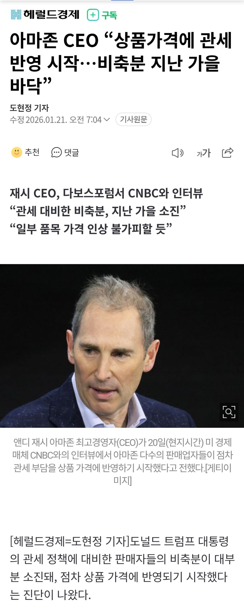 CAFE 아마존 CEO “상품가격에 관세 반영 시작…비축분 지난 가을 바닥” 도탁스 (DOTAX) 작성자하루견과먹자 작성시간26.01.21 앱으로보기 https://n.news.naver.com/mnews/article/016/0002588605?sid=104아마존 CEO “상품가격에 관세 반영 시작…비축분 지난 가을 바닥”재시 CEO, 다보스포럼서 CNBC와 인터뷰 “관세 대비한 비축분, 지난 가을 소진” “일부 품목 가격 인상 불가피할 듯” 앤디 재시 아마존 최고경영자(CEO)가 20일(현지시간) 미 경제매체 CNBC와의 인n.news.naver.com 카페방문 댓글 13 현재 게시글 추가 기능 열기 공유하기 신고 센터로 신고