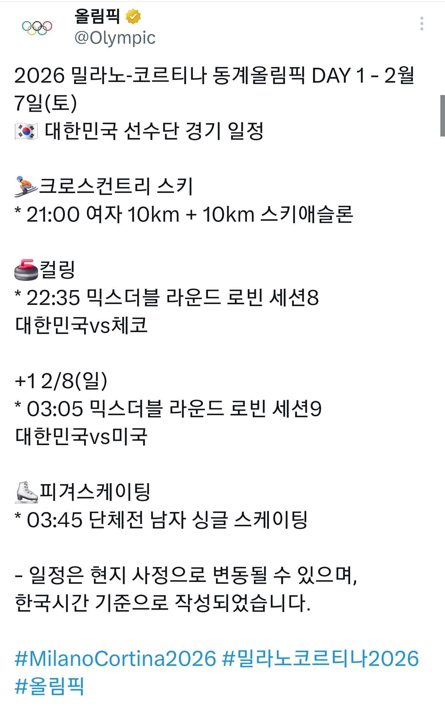 도탁스 (DOTAX) [[기타]][동계올림픽] 대회 1일차, 대한민국 선수단 경기 일정(수정) 작성시간26.02.07|조회수1,921 목록 댓글 1 글자크기 작게가 글자크기 크게가 다음검색 현재 게시글 추가 기능 열기 북마크 공유하기 신고 센터로 신고 댓글 1 댓글 리스트 작성시간 26.02.07 시간 안맞으니 더 보기가 힘드넹ㅜ 스포츠는 라이브로 봐야 재밌는데..흑흑 카페 방문해 더 많은 댓글 만나기!