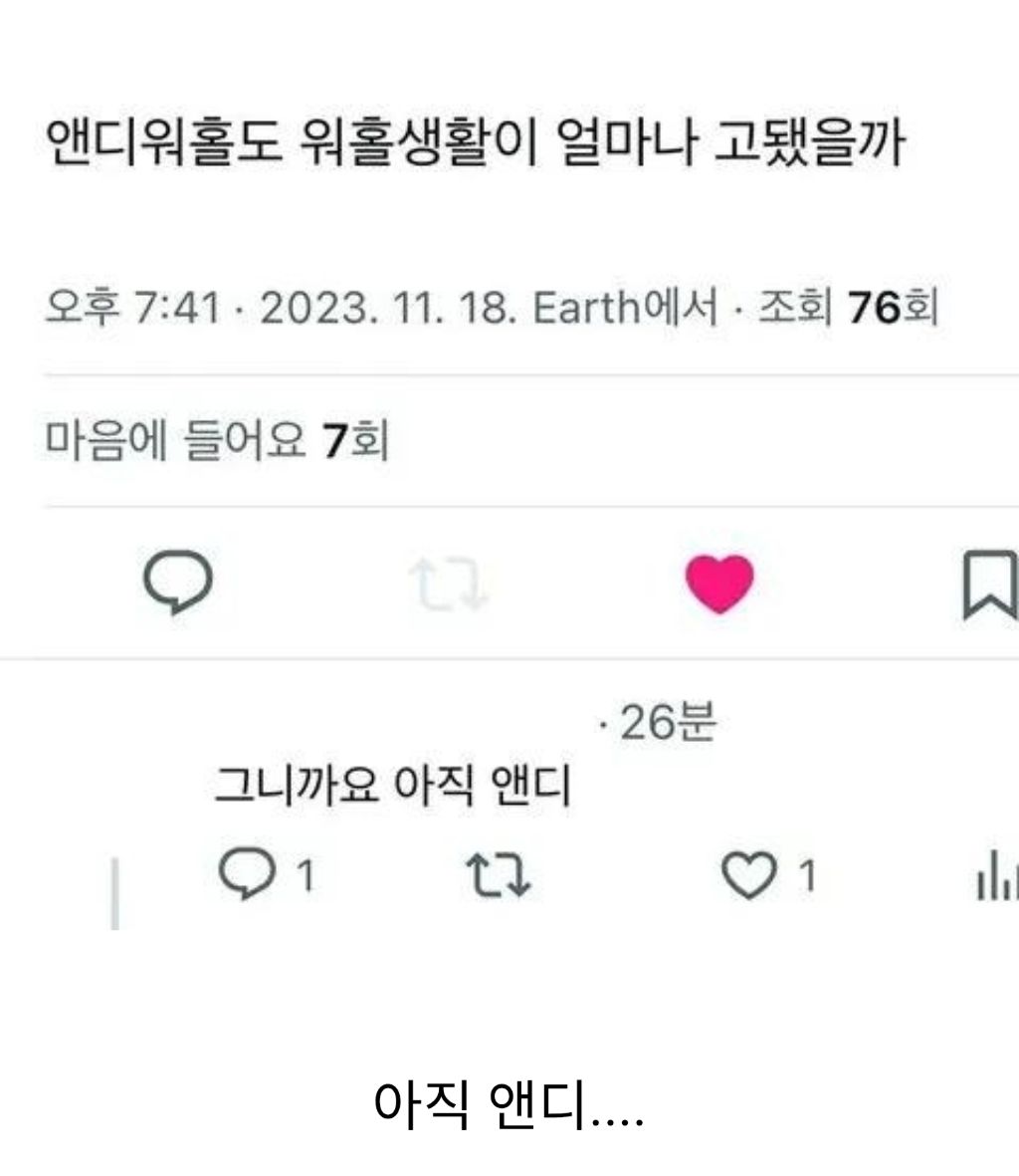 도탁스 (DOTAX) 앤디 워홀은 얼마나 고됐을까 작성시간26.02.21|조회수7,843 목록 댓글 6 글자크기 작게가 글자크기 크게가 다음검색 현재 게시글 추가 기능 열기 북마크 공유하기 신고 센터로 신고 댓글 6 댓글 리스트 작성시간 26.02.21 앤디 워홀 가서 어케 살았디야 작성시간 26.02.21 ㅋㅋㅋㅋㅋㅋㅋㅋ 작성시간 26.02.21 ㅋㅋㅋㅋㅋㅋㅋㅋㅋㅋㅋㅋㅋㅋㅋㅋㅋㅋㅋㅋㅋ 기가 막히게 받았네 작성시간 26.02.21 똥을싸라 작성시간 26.02.21 애인디 워홀을 어케 버텼디야 .. 카페 방문해 더 많은 댓글 만나기!