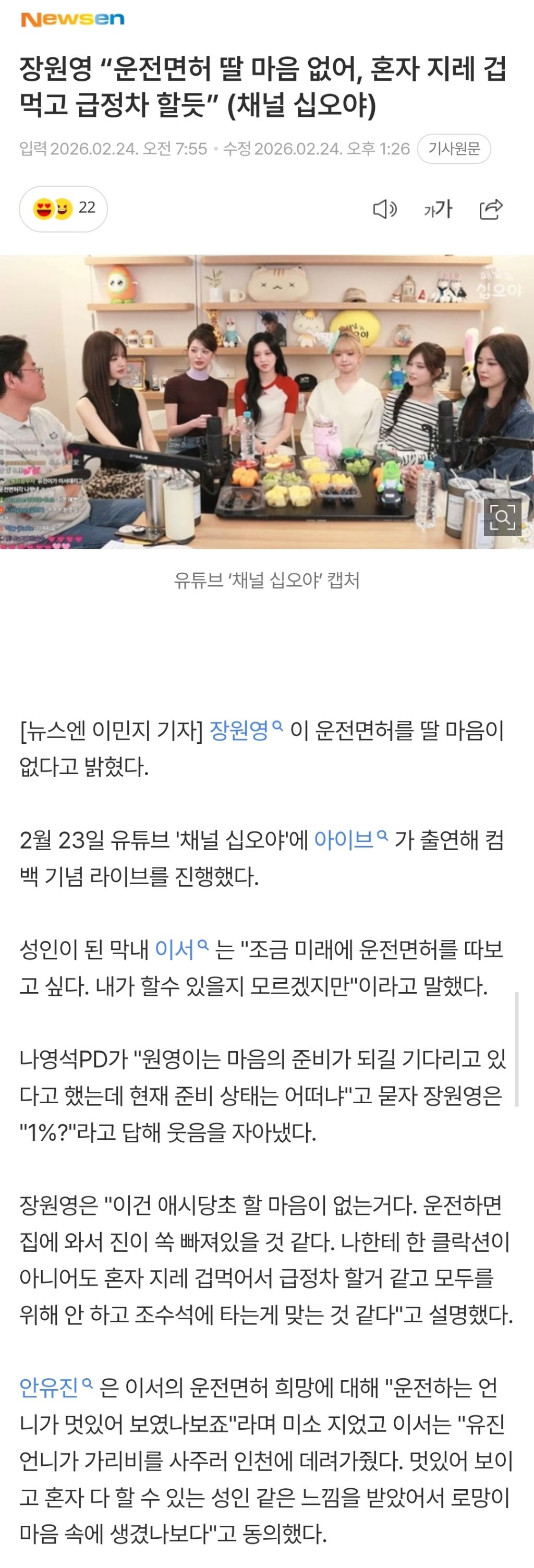 도탁스 (DOTAX) [[연예인]]장원영 “운전면허 딸 마음 없어, 혼자 지레 겁먹고 급정차 할듯” 작성시간26.02.24|조회수23,515 목록 댓글 20 글자크기 작게가 글자크기 크게가 https://naver.me/52arqBvt장원영 “운전면허 딸 마음 없어, 혼자 지레 겁먹고 급정차 할듯” (채널 십오야)여기를 눌러 링크를 확인하세요m.entertain.naver.com 다음검색 현재 게시글 추가 기능 열기 북마크 공유하기 신고 센터로 신고 댓글 20 댓글 리스트 작성시간 26.02.24 작성시간 26.02.24 운전기사 지원합니다 작성시간 26.02.24 쫄보녕ㅋㅋㅋㅋ 작성시간 26.02.24 돈많으면 ㄹㅇ 필요없지.기사쓰면되는데 작성시간 26.02.26 오히려 저렇게 겁먹고 그럼막상 면허따고 조심운전 잘하는 사람들도 꽤 있는데 ㅋㅋㅋ 카페 방문해 더 많은 댓글 만나기!