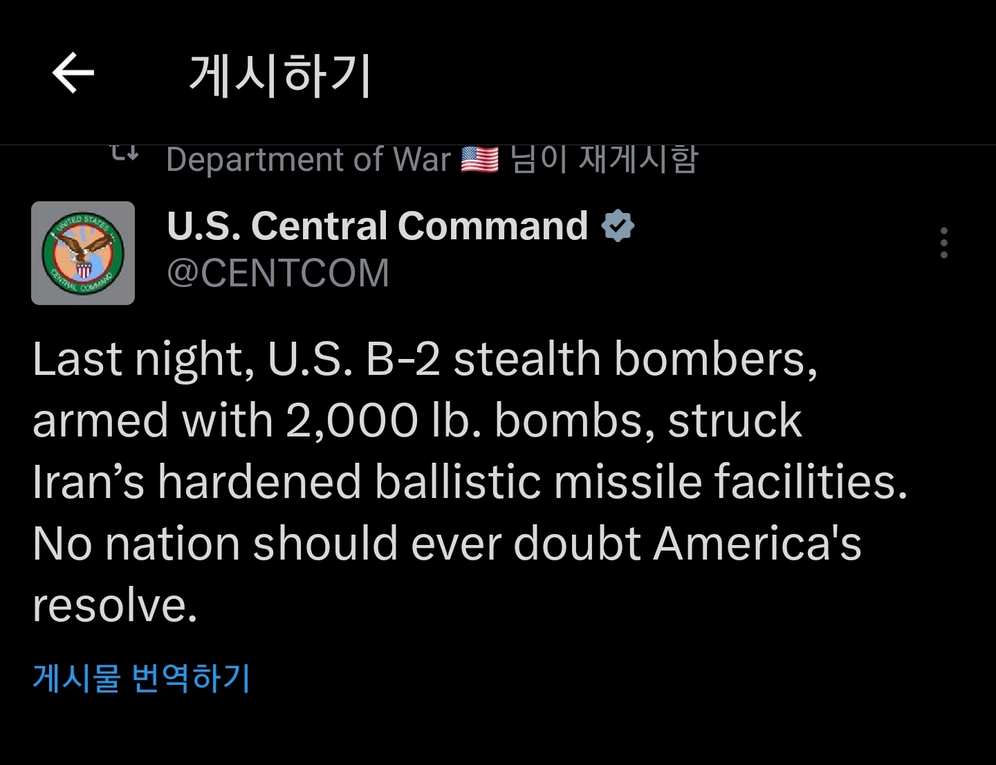 2000파운드(907kg)로 무장한 B2 스텔스 폭격기가 이란의 탄도미사일 시설을 공격했습니다.