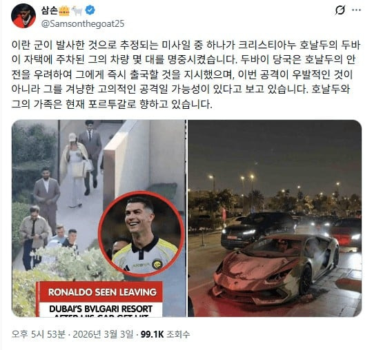 오늘 호날두가 서둘러서 두바이를 떠난 이유 작성자둘기얏|작성시간26.03.03|조회수13,902 목록 댓글 15 글자크기 작게가 글자크기 크게가 다음검색 현재 게시글 추가 기능 열기 북마크 공유하기 신고 센터로 신고 댓글 댓글 15 댓글쓰기 답글쓰기 댓글 리스트 작성자나르갓 | 작성시간 26.03.04 탄두.. 작성자홍수현 | 작성시간 26.03.04 이건 노쇼해라 작성자freely_fly | 작성시간 26.03.04 쫄았두... 작성자알라꿍숑 | 작성시간 26.03.04 호다닥 도망갔대두 작성자카페도탁스 | 작성시간 26.03.04 siuuuuu 댓글 전체보기