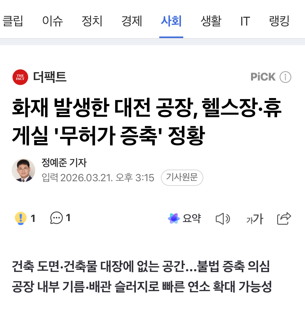 화재 발생한 대전 공장, 헬스장·휴게실 '무허가 증축' 정황 작성자충무공 이순신|작성시간26.03.21|조회수2,574 목록 댓글 2 글자크기 작게가 글자크기 크게가 https://n.news.naver.com/article/629/0000483731?sid=102화재 발생한 대전 공장, 헬스장·휴게실 '무허가 증축' 정황건축 도면·건축물 대장에 없는 공간…불법 증축 의심 공장 내부 기름·배관 슬러지로 빠른 연소 확대 가능성 대전시 대덕구 문평동 자동차 부품 공장 화재로 현재까지 11명의 사망자가 발생한 n.news.naver.com건축 도면·건축물 대장에 없는 공간…불법 증축 의심 다음검색 현재 게시글 추가 기능 열기 북마크 공유하기 신고 센터로 신고 댓글 댓글 2 댓글쓰기 답글쓰기 댓글 리스트 작성자나 따위가 무슨. | 작성시간 26.03.21 아이고,, 작성자허언비대증 | 작성시간 26.03.21 복지시설 불법 증축이라니 댓글 전체보기