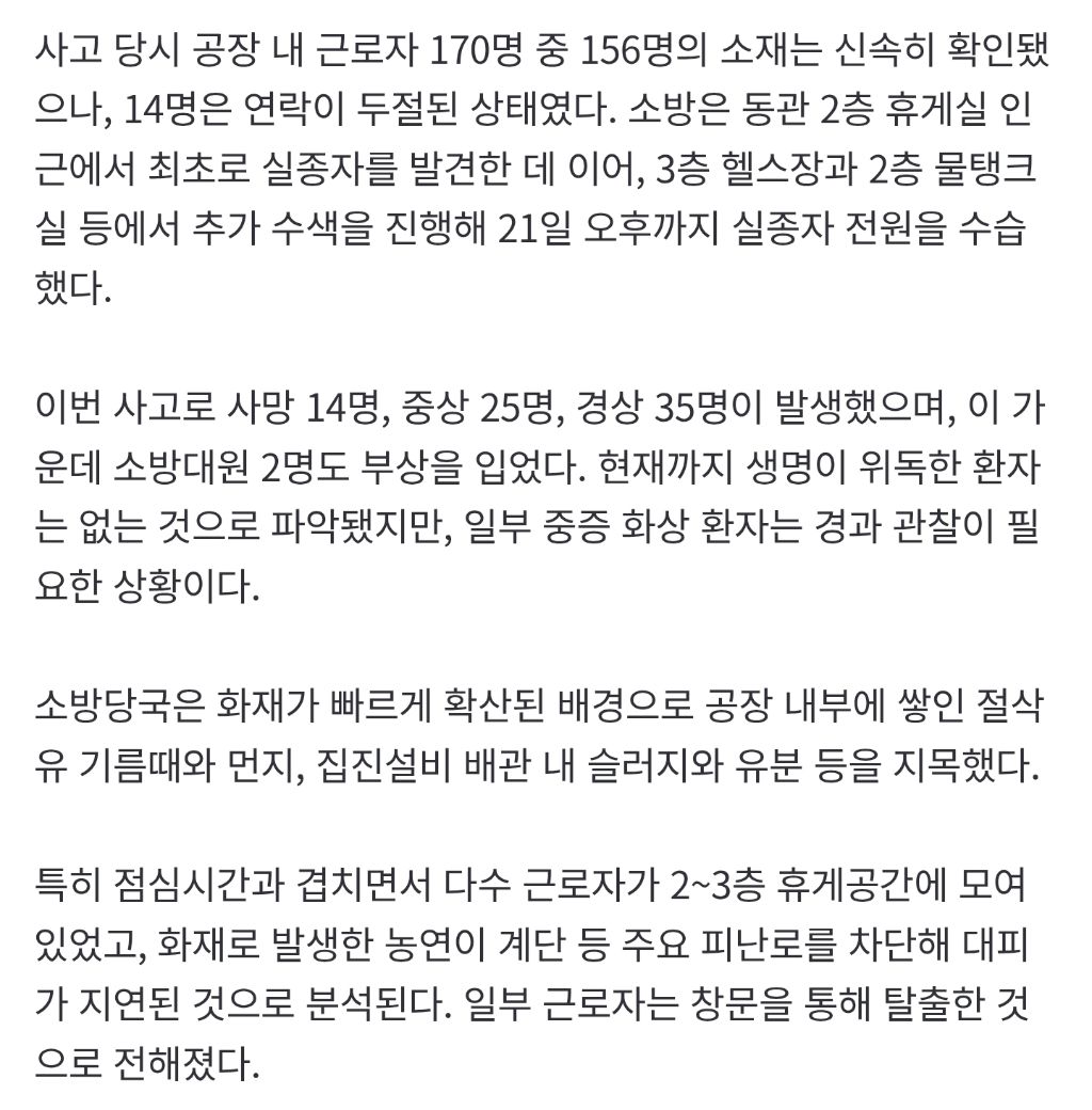[[뉴스]]대전 공장 화재 14명 사망…마지막 실종자까지 수습 작성자Miyeon|작성시간26.03.21|조회수11,670 목록 댓글 11 글자크기 작게가 글자크기 크게가 https://n.news.naver.com/article/014/0005495109?sid=102대전 공장 화재 14명 사망…마지막 실종자까지 수습대전 대덕구 문평동 자동차 부품 제조 공장에서 발생한 화재로 14명이 숨지고 60여 명이 다치는 등 총 74명의 인명피해가 발생했다. 소방당국은 실종자 14명을 모두 발견·수습하고 수색·구조 활n.news.naver.com 다음검색 현재 게시글 추가 기능 열기 북마크 공유하기 신고 센터로 신고 댓글 댓글 11 댓글쓰기 답글쓰기 댓글 리스트 작성자카스타드술빵 | 작성시간 26.03.21 공장 건물 주변부에 화단 이런거 설치 못하게 막아야될 듯 에어매트 설치만 가능했어도.. 작성자Taupe | 작성시간 26.03.21 하... 작성자니나브 | 작성시간 26.03.21 아이고... 작성자방쿠 | 작성시간 26.03.21 하... 삼가 고인의 명복을 빕니다... 작성자Kingswag | 작성시간 26.03.21 삼가고인의 명복을 빕니다.. 댓글 전체보기