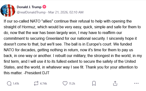 "우리의 이른바 나토(NATO) '동맹'들이 호르무즈 해협을 개방하는 일에 계속 협력을 거부한다면 — 전쟁에서 대부분 승리한 지금 시점에서 해협 개방은 그들에게 매우 쉽고, 빠르며, 간단하고 안전한 일임에도 불구하고 말입니다 — 나는 국가 안보를 위해 그린란드(Greenland)를 확보하겠다는 우리의 약속을 재확인해야 할지도 모릅니다.