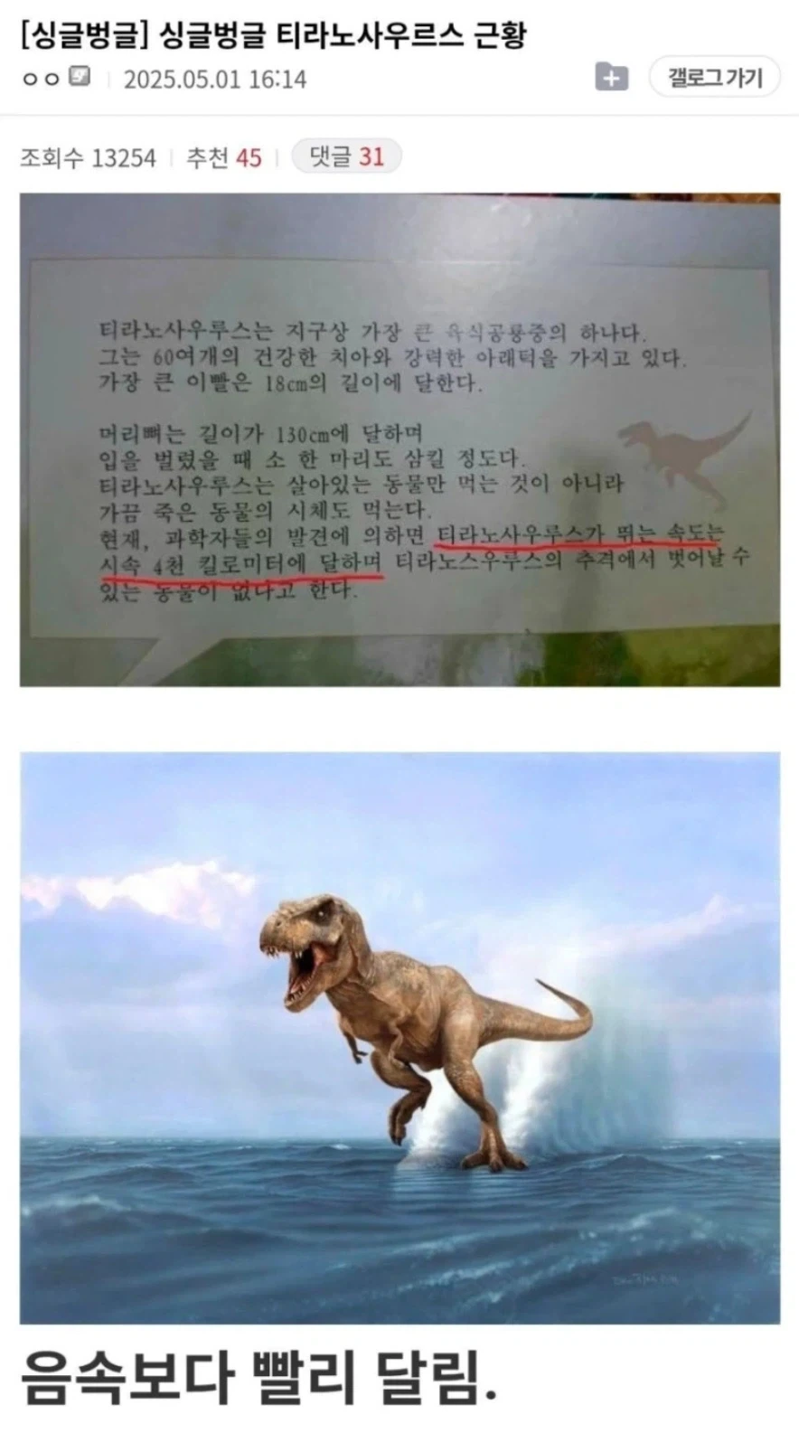 도탁스 (DOTAX) [[기타]]티라노 사우르스 근황 작성시간26.03.22|조회수28,762 목록 댓글 6 글자크기 작게가 글자크기 크게가 다음검색 현재 게시글 추가 기능 열기 북마크 공유하기 신고 센터로 신고 댓글 6 댓글 리스트 작성시간 26.03.22 ㄷㄷ 작성시간 26.03.22 ㅋㅋㅋㅋㅋㅋㅋㅋㅋㅋㅋㅋ 작성시간 26.03.22 슈퍼소닉 사우루스 작성시간 26.03.22 슈퍼타조였던것 작성시간 26.03.22 저 속도로오면 못도망가지 카페 방문해 더 많은 댓글 만나기!