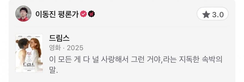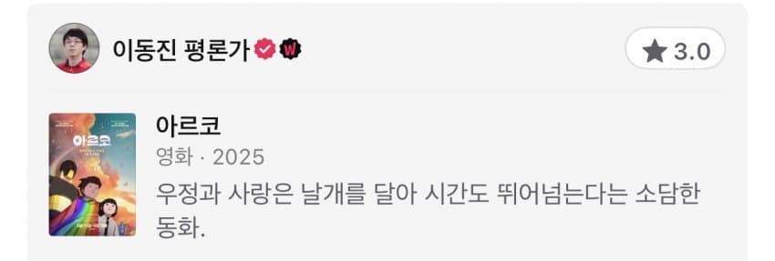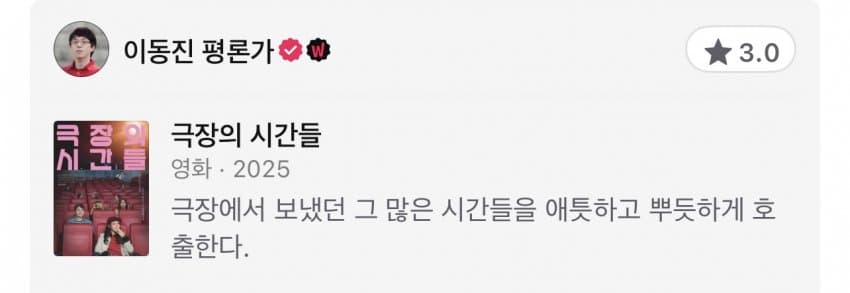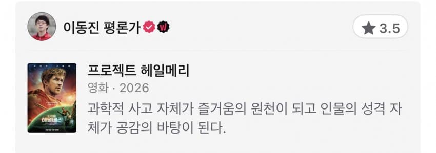이동진 평론가 이번주 별점 및 한줄평.jpg 작성자YANKEES|작성시간26.03.22|조회수10,680 목록 댓글 6 글자크기 작게가 글자크기 크게가 다음검색 현재 게시글 추가 기능 열기 북마크 공유하기 신고 센터로 신고 댓글 댓글 6 댓글쓰기 답글쓰기 댓글 리스트 작성자SYSTEM 99 | 작성시간 26.03.22 아르코는 좀 늦게봤네 작성자의인화 | 작성시간 26.03.22 헤일메리 존잼 작성자This Is Valley | 작성시간 26.03.23 책이 4점이라 역시 책보단 낮네 작성자아이유15년차 | 작성시간 26.03.23 헤일메리 보다 움 ㅠㅠ 졸라 감동적 작성자개굴리 | 작성시간 26.03.23 헤일메리 좋음 댓글 전체보기