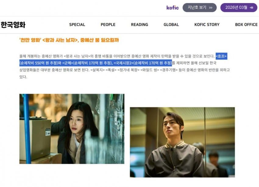 나홍진 호프 순제작비 550억원.jpg 작성자YANKEES|작성시간26.03.23|조회수3,016 목록 댓글 2 글자크기 작게가 글자크기 크게가 https://magazine.kofic.or.kr/webzine/web2/2784/pdsView.do웹매거진 한국영화대박 아니어도 괜찮다magazine.kofic.or.kr 다음검색 현재 게시글 추가 기능 열기 북마크 공유하기 신고 센터로 신고 댓글 댓글 2 댓글쓰기 답글쓰기 댓글 리스트 작성자다이드 | 작성시간 26.03.23 호프도 바이럴 잘하면 지금 시기면 가능 작성자켄틸레버 | 작성시간 26.03.23 해외에서 잘 팔려야 하는데 상대가 하필 오디세이랑 스파이더맨이네 댓글 전체보기