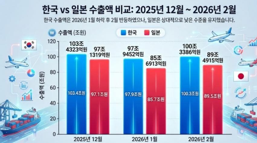 역전되어버린 한일 수출액 작성자하루견과먹자|작성시간26.03.23|조회수8,218 목록 댓글 3 글자크기 작게가 글자크기 크게가 반도체 호황기로 역전 다음검색 현재 게시글 추가 기능 열기 북마크 공유하기 신고 센터로 신고 댓글 댓글 3 댓글쓰기 답글쓰기 댓글 리스트 작성자unfair | 작성시간 26.03.23 일본은 내수가 커서 그런가 작성자느타리버섯 | 작성시간 26.03.23 반도체, 방산빨인듯 이건 작성자독일혼욕탕 | 작성시간 26.03.23 인구수 생각하면 개쩌네 우리나라 댓글 전체보기