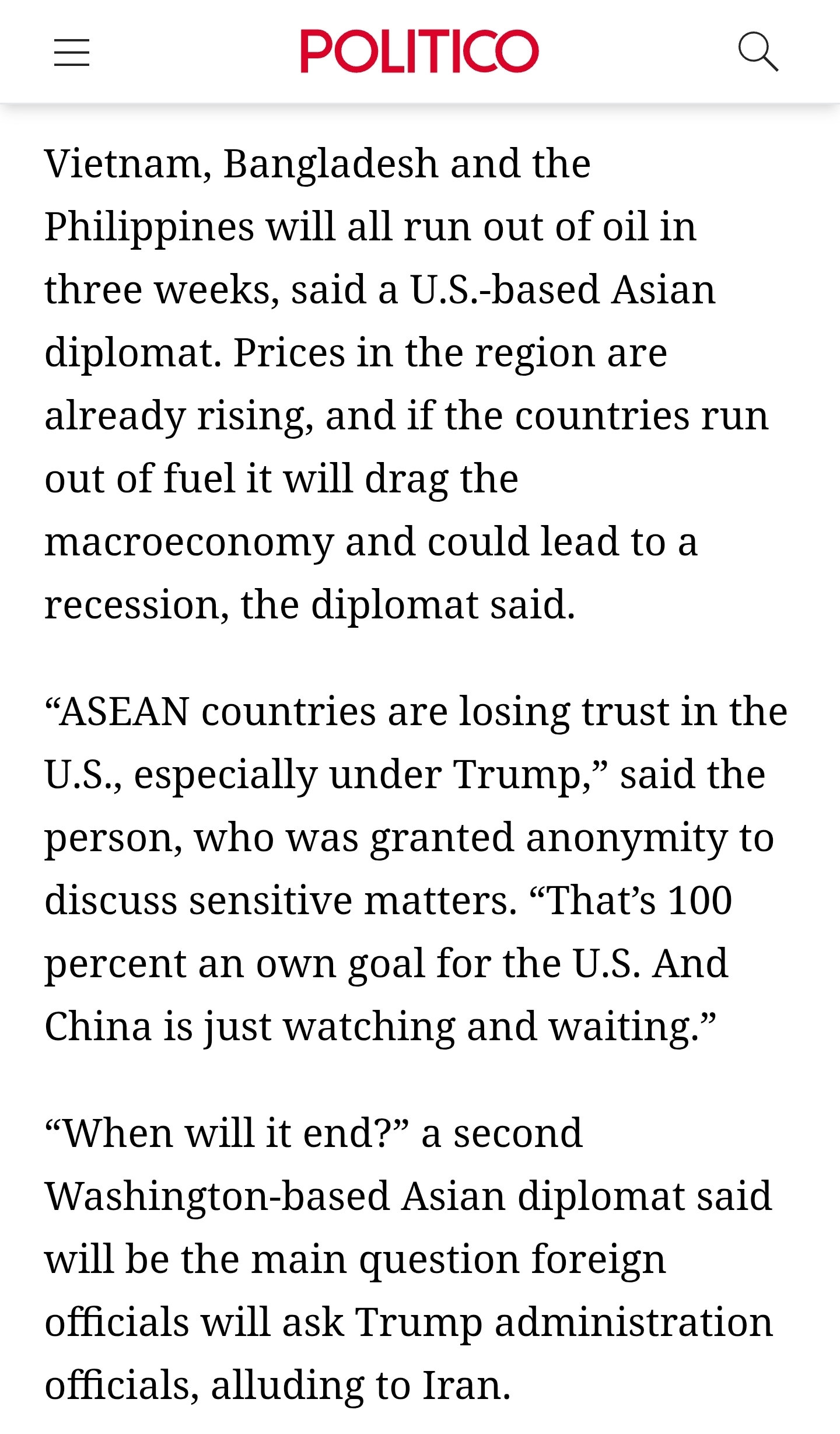 한 아시아 외교관에 따르면, 베트남·방글라데시·필리핀은 약 3주 내 석유가 고갈될 수 있다. 이미 가격은 상승 중이며, 연료 부족이 현실화될 경우 거시경제에 충격을 주고 경기 침체로 이어질 가능성이 있다.