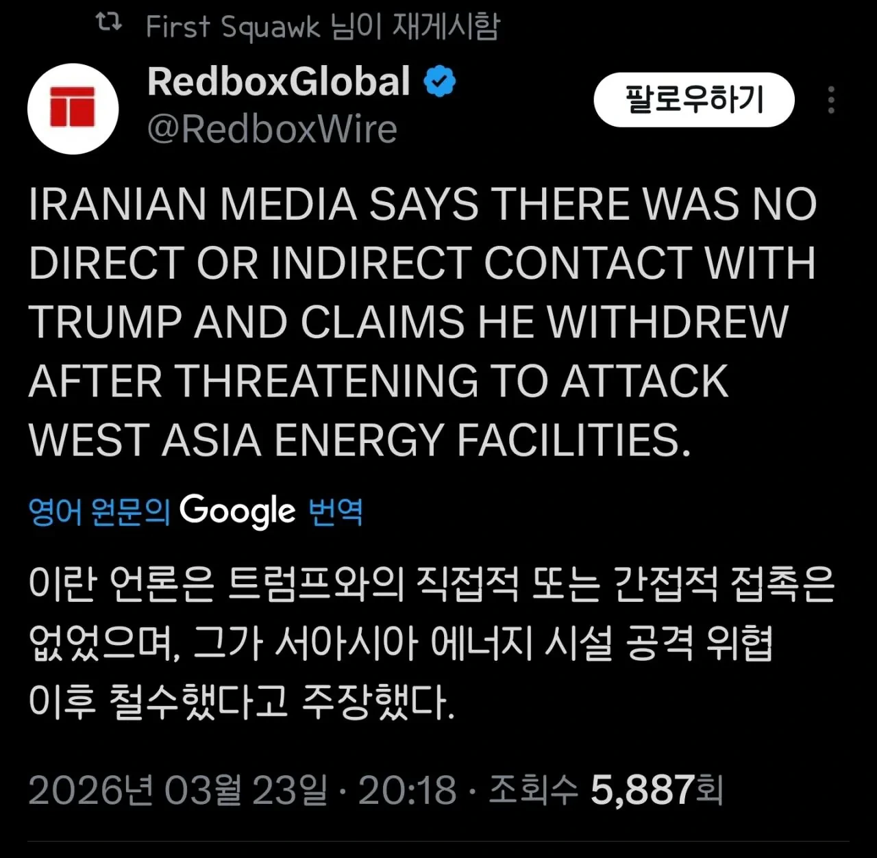 속보) 이란 曰 : 트럼프랑 협상한적 없는데 무슨 소리냐? 작성자네코 유키치|작성시간26.03.23|조회수6,062 목록 댓글 22 글자크기 작게가 글자크기 크게가 다음검색 현재 게시글 추가 기능 열기 북마크 공유하기 신고 센터로 신고 댓글 댓글 22 댓글쓰기 답글쓰기 댓글 리스트 작성자별을보는아이 | 작성시간 26.03.23 ㅋㅋㅋㅋㅋㅋㅋㅋㅋㅋㅋㅋ 작성자나엔 | 작성시간 26.03.23 ㅋㅋㅋㅋㅋ 작성자임복동 | 작성시간 26.03.23 타코색 진짜 어떻게 하지 작성자용녀의몸부림 | 작성시간 26.03.23 폰휴전 ㄷㄷ 작성자호떡호떡 | 작성시간 26.03.23 ㅋㅋㅋㅋㅋㅋㅋㅋㅋㅋㅋㅋㅋㅋㅋ근데 주식은 뭐 떡상이네 댓글 전체보기