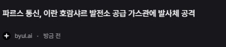 미군, 이란 가스 발전소 공격 감행 작성자내꿈은롯데우승보ㄱI|작성시간26.03.24|조회수4,983 목록 댓글 15 글자크기 작게가 글자크기 크게가 다음검색 현재 게시글 추가 기능 열기 북마크 공유하기 신고 센터로 신고 댓글 댓글 15 댓글쓰기 답글쓰기 댓글 리스트 작성자C-Dog | 작성시간 26.03.24 그냥 롱숏 발라먹으려고 전쟁한걱 ㅏㅌ음. 작성자양이에오 | 작성시간 26.03.24 안 한다매 작성자트랭크스 | 작성시간 26.03.24 니네 장 닫겼다 이거여? 답댓글 작성자아힝홍헹 | 작성시간 26.03.24 트럼프아들놈이 간밤에 석유관련 주 이득보고 팔았음.ㅋㅋㅋ 작성자포아탄 | 작성시간 26.03.24 ㅋㅋㅋㅋ 개웃기네 미친놈이네 진짜 댓글 전체보기