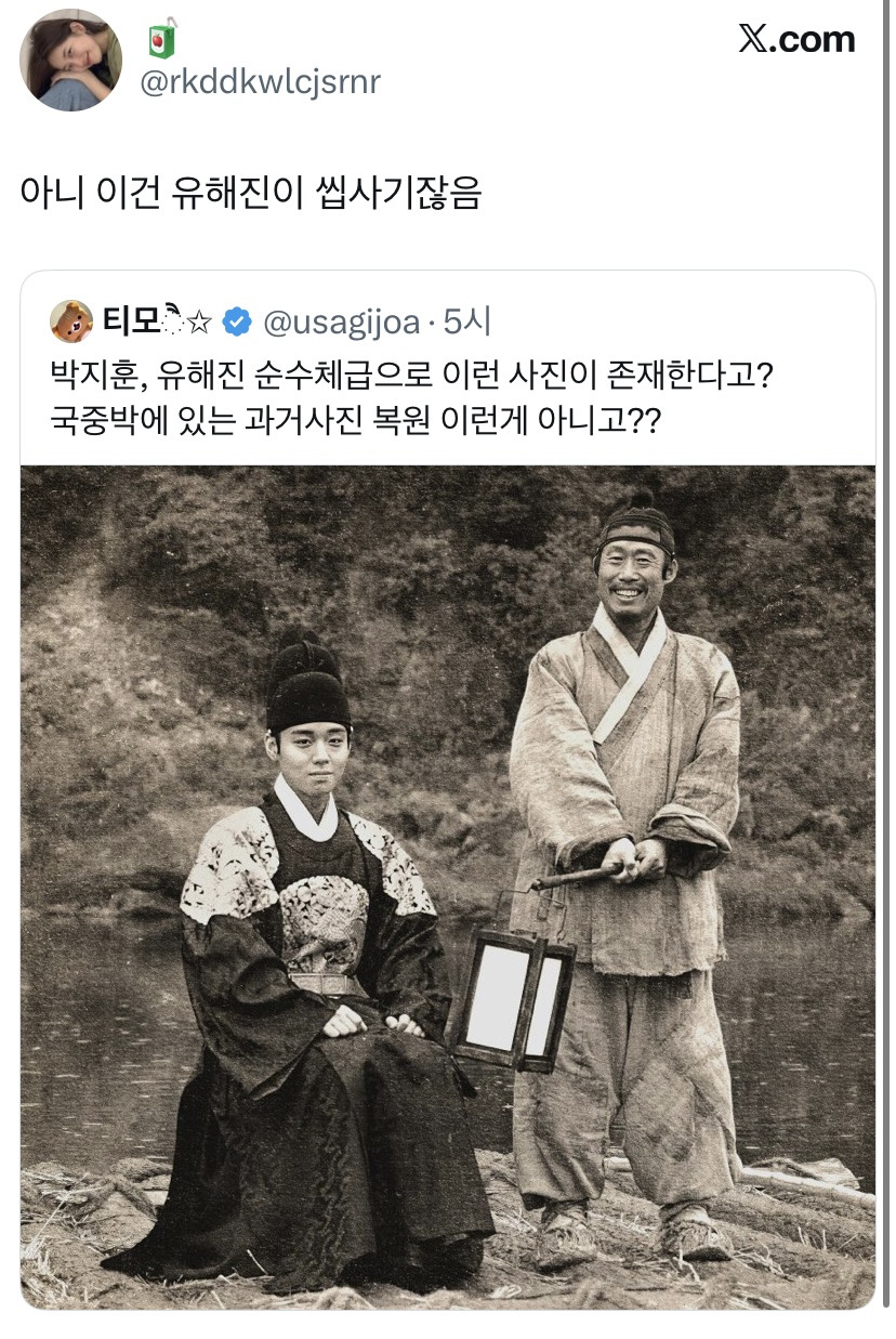 [스크랩] 박지훈 유해진 순수체급으로 이런 사진이 존재한다고? 국중박에 있는 과거사진 복원 이런게 아니라? 작성자아르르르탁칵|작성시간26.03.27|조회수22,245 목록 댓글 12 글자크기 작게가 글자크기 크게가 출처: https://x.com/i/status/2035545213226414542유해진 그냥 저시대 사람 데려온거 아니야? 다음검색 스크랩 원문 : *여성시대* 차분한 20대들의 알흠다운 공간 현재 게시글 추가 기능 열기 북마크 공유하기 신고 센터로 신고 댓글 댓글 12 댓글쓰기 답글쓰기 댓글 리스트 작성자하늘이기여어 | 작성시간 26.03.27 말하는 거 개웃기네 ㅋㅋㅋㅋㅋ 작성자제발가랑이밑으로들어가게해주세요 | 작성시간 26.03.27 동학농민운동상임 작성자맥스웰방정식도모르는새끼가어디서 | 작성시간 26.03.27 이건 진짜 외국에 내다팔면 모를듯 작성자머슥타드 | 작성시간 26.03.27 ㅋㅋㅋㅋㅋㅌㅋ 작성자사나없이산와만와 | 작성시간 26.03.28 아 국사책에서 분명히 봤는데 댓글 전체보기