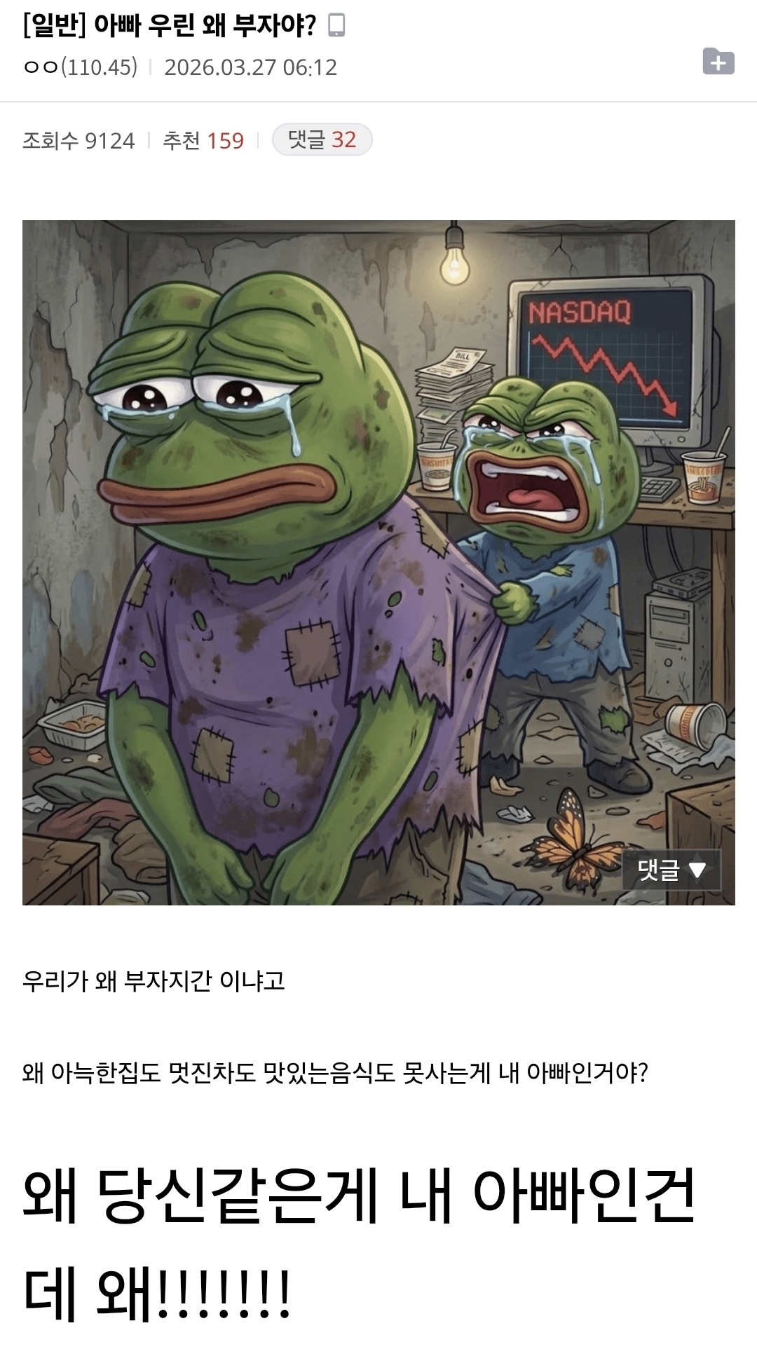 미주갤) 아빠 우린 왜 부자야? 작성자따라하지말라고|작성시간26.03.27|조회수4,590 목록 댓글 5 글자크기 작게가 글자크기 크게가 다음검색 현재 게시글 추가 기능 열기 북마크 공유하기 신고 센터로 신고 댓글 댓글 5 댓글쓰기 답글쓰기 댓글 리스트 작성자전체차단 | 작성시간 26.03.27 그래도 지붕있는 집있고 전기 들어오네 작성자꼬꼬리몽 | 작성시간 26.03.27 시작인가ㅋㅋㅋㅋㅋ 작성자위르겐 클롭 | 작성시간 26.03.27 집에 나비도 키우네 부자맞네 작성자아미슈 | 작성시간 26.03.27 나스닥도 많이떨어졌나보네 작성자카페도탁스 | 작성시간 26.03.27 ㅋㅋㅋㅋㅋㅌㅌㅌㅌㅌ 댓글 전체보기