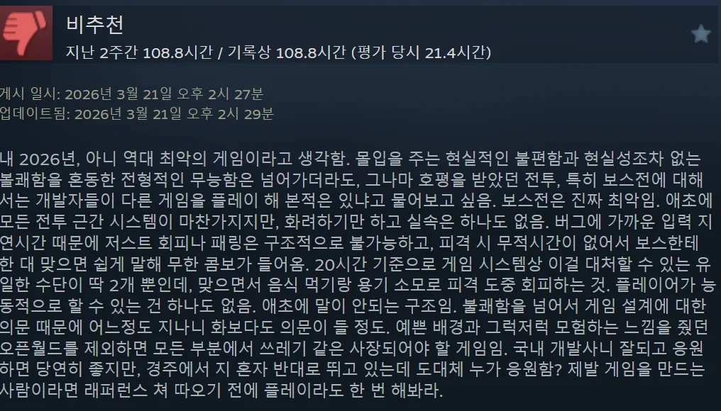 붉은사막 리뷰 중 goat 작성자As you wish|작성시간26.03.27|조회수5,119 목록 댓글 34 글자크기 작게가 글자크기 크게가 이제 출시 일주일 된 게임을108.8 시간 하며 ㅋㅋㅋ 다음검색 현재 게시글 추가 기능 열기 북마크 공유하기 신고 센터로 신고 댓글 댓글 34 댓글쓰기 답글쓰기 댓글 리스트 작성자젤라또 | 작성시간 26.03.27 일주일은 168시간이다 작성자300표가진분 | 작성시간 26.03.27 ㅋㅋㅋㅋㅋㅋㅋㅋㅋ최악이지만 이것만한다 작성자검색가능한닉네임 | 작성시간 26.03.27 점점 늘어 ㅋㅋㅋㅋㅋ 작성자뫼엥고스틴 | 작성시간 26.03.27 아니 저번에 봤을때 90시간이었는데 그새 18시간 늘었네 ㅋㅋㅋㅋㅋㅋㅋㅋ 작성자복심지우 | 작성시간 26.03.27 이럴 거면 리뷰 긍정적으로 돌리라고 ㅋㅋ 댓글 전체보기