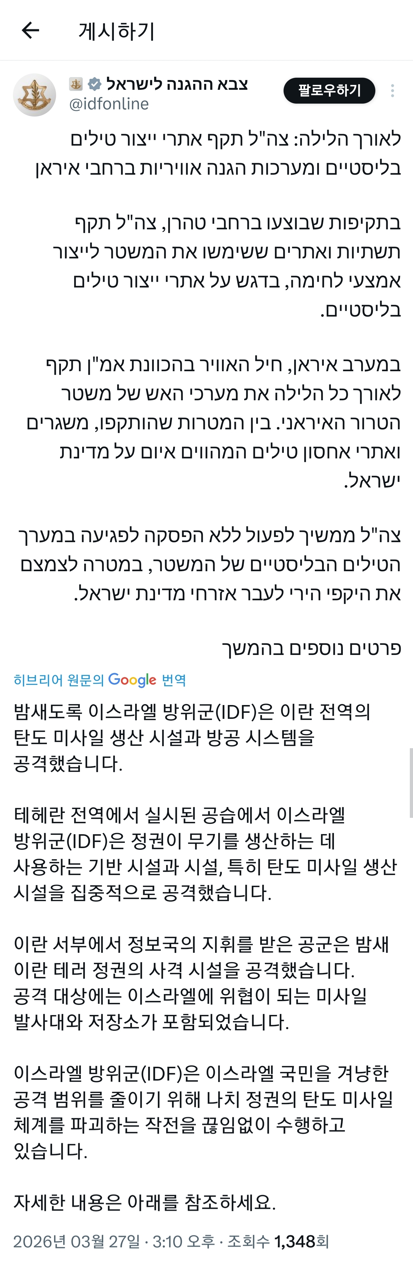 [[기타]]이스라엘군 = 밤새도록 이란을 공습하고 왔습니다! 작성자스타의일생|작성시간26.03.27|조회수2,396 목록 댓글 1 글자크기 작게가 글자크기 크게가 ㅋㅋㅋㅋㅋㅋㅋㅋㅋㅋㅋㅋㅋ 얘네들 진짜 대단하다 다음검색 현재 게시글 추가 기능 열기 북마크 공유하기 신고 센터로 신고 댓글 댓글 1 댓글쓰기 답글쓰기 댓글 리스트 작성자밍글스 | 작성시간 26.03.27 시발롬들아 댓글 전체보기