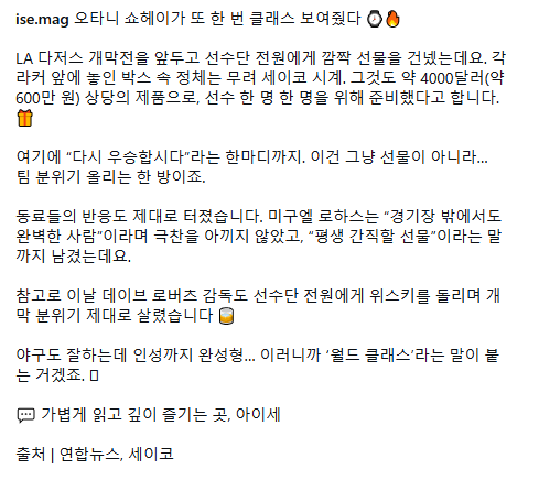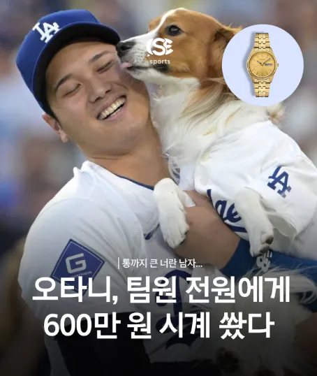 선수단 전원에게 시계 선물한 오타니 쇼헤이 ㄷㄷㄷ 작성자우주소녀보나|작성시간26.03.27|조회수9,062 목록 댓글 13 글자크기 작게가 글자크기 크게가 로스터 26인이면 1억 5000만원코칭스태프 전체라면 50명 3억원 ㄷㄷㄷ참고로 오타니 연봉은 30억원, 연봉외 수입은 1872억 다음검색 현재 게시글 추가 기능 열기 북마크 공유하기 신고 센터로 신고 댓글 댓글 13 댓글쓰기 답글쓰기 댓글 리스트 작성자변 검 | 작성시간 26.03.28 검소하네 작성자우리집에왜왔니 | 작성시간 26.03.28 천만원짜리 롤렉스는 해야지 임마 작성자초코다이제맛나 | 작성시간 26.03.28 일본꺼 사서 선물하니 일본내 이미지도 더 좋아지겠네 답댓글 작성자Jamiroquai | 작성시간 26.03.28 오타니 세이코 모델로 알아요. 작성자스카이점프 | 작성시간 26.03.28 그랜드세이코 가격인가 댓글 전체보기