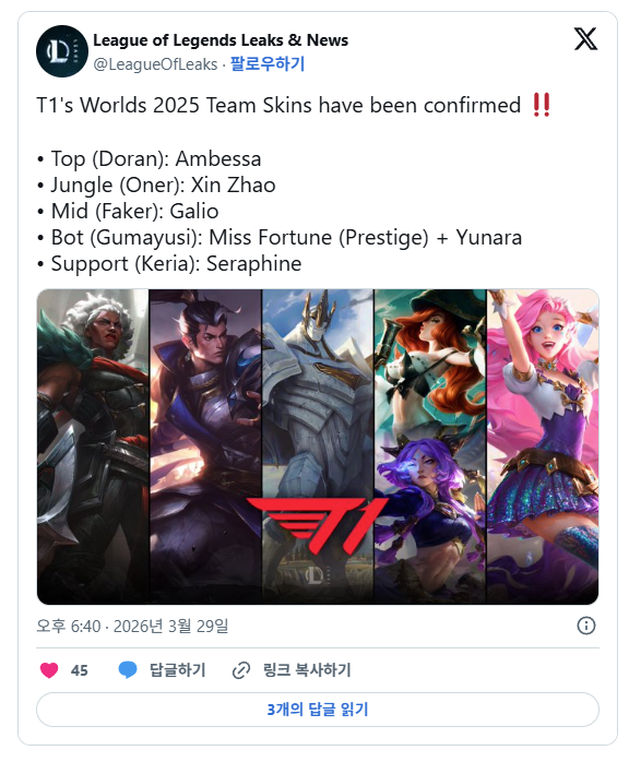 [[LOL]]2025 T1 우승 스킨 유출? 확정? 작성자깁미두쫀쿠|작성시간26.03.29|조회수11,854 목록 댓글 11 글자크기 작게가 글자크기 크게가 롤 스킨 유출 유튜버가 확인하고 트윗암베사 / 신 짜오 / 갈리오 / 유나라 & 미스 포춘 (프레스티지) / 세라핀 다음검색 현재 게시글 추가 기능 열기 북마크 공유하기 신고 센터로 신고 댓글 댓글 11 댓글쓰기 답글쓰기 댓글 리스트 답댓글 작성자원딜위주로해 | 작성시간 26.03.29 도란이 요청했으나 거절 ㅠ 작성자뚱땅 | 작성시간 26.03.29 갈리오 가주앙~ 작성자화가나 | 작성시간 26.03.29 궁 쓰면 T1 마크 나오겠지?? 작성자산골짜기 | 작성시간 26.03.29 드디어 갈리오니? 작성자옆집누렁이 | 작성시간 26.03.30 유나라 프레스티지로 주지 ㅠ 댓글 전체보기