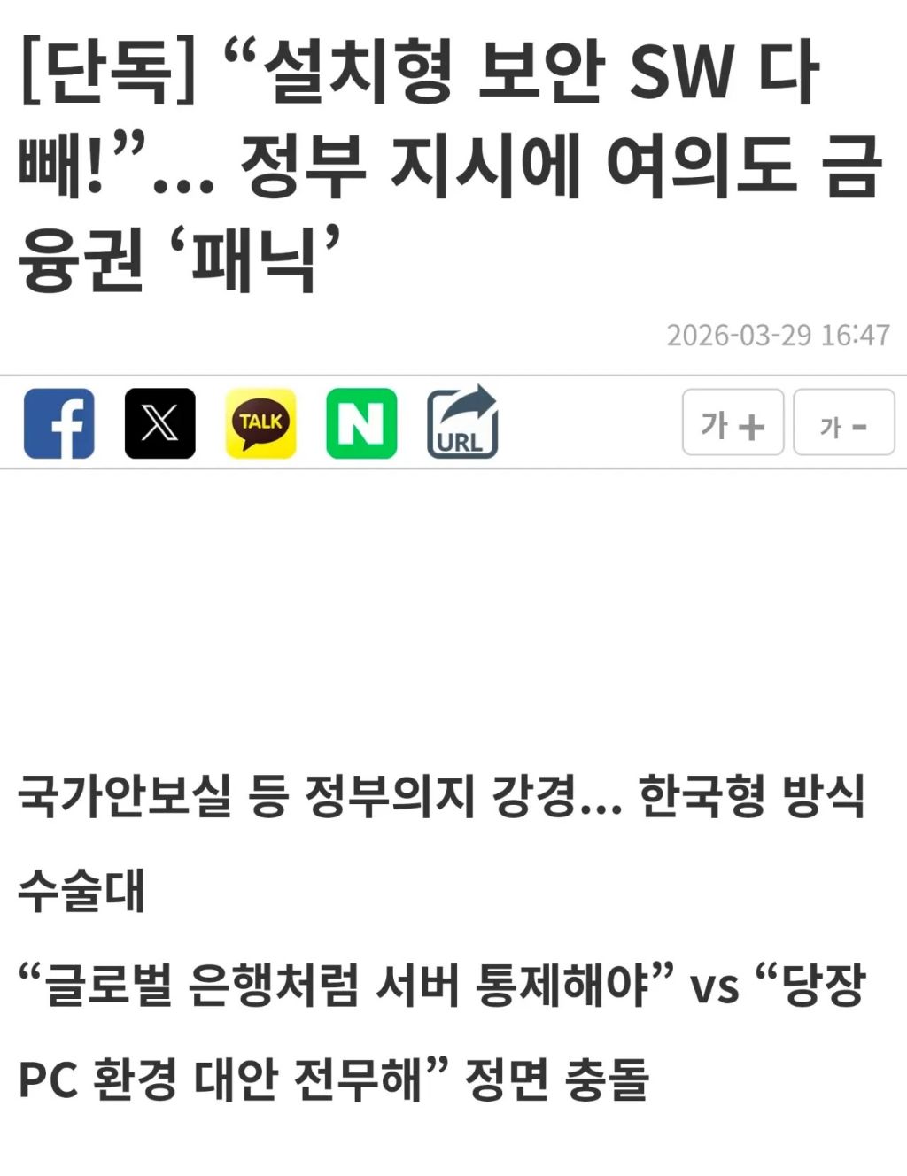 설치형 보안 SW 다 빼! 정부 지시에 여의도 금융권 "패닉" 작성자多주|작성시간26.03.29|조회수6,343 목록 댓글 42 글자크기 작게가 글자크기 크게가 https://m.boannews.com/html/detail.html?idx=142897&skind=6[단독] “설치형 보안 SW 다 빼!”... 정부 지시에 여의도 금융권 ‘패닉’범부처 차원의 정보보호 종합대책의 일환으로 금융권 설치형 보안 소프트웨어 강제 폐지가 급물살을 타며 대격변이 예고됐다. 정부는 글로벌 스탠더드에 맞춘 근본적 체질 개선을 강력히 요구m.boannews.com개같은 보안 프로그램 정상화 ㅅㅅㅅ 다음검색 현재 게시글 추가 기능 열기 북마크 공유하기 신고 센터로 신고 댓글 댓글 42 댓글쓰기 답글쓰기 댓글 리스트 작성자카피바라 | 작성시간 26.03.29 드디어 정상화간다 금융권 가새기들 ㅋㅋㅋ 작성자아힝아힝 | 작성시간 26.03.29 일하는거보면 신세계긴 해~ 작성자히데 | 작성시간 26.03.30 개줫같은새끼들 대가리싸메고 개선해라 ㅋㅋ 작성자무케마루 | 작성시간 26.03.30 오 씨발 드디어... .이걸 드디어 하네 작성자사나없이산와만와 | 작성시간 26.03.30 와씨 와... 와... 댓글 전체보기