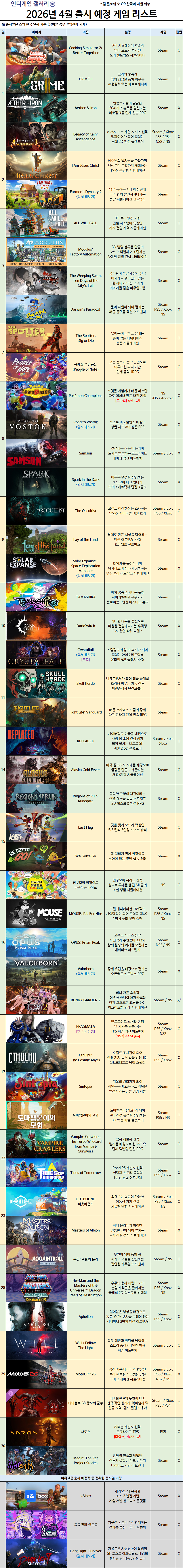 [[정보]]2026년 4월 출시 예정 게임 리스트.PNG 작성자수리K|작성시간26.03.30|조회수3,128 목록 댓글 10 글자크기 작게가 글자크기 크게가 다음검색 현재 게시글 추가 기능 열기 북마크 공유하기 신고 센터로 신고 댓글 댓글 10 댓글쓰기 답글쓰기 댓글 리스트 작성자RightLeftRight | 작성시간 26.03.30 007 나올때까지 붉사만 해야지 작성자겨울이는댕댕이 | 작성시간 26.03.30 바니가든2 으흐흐한 교류를 하는 게임 작성자퍼리 | 작성시간 26.03.30 프래그마타밖에 기대되는게 읍네 작성자good4611 | 작성시간 26.03.31 가벼운 설명까지 좋다 작성자인구리 | 작성시간 26.04.01 요즘겜 너무 다 똑같음.. 그냥 디아3 시즌 하는데 그게 더 잼남.. 댓글 전체보기