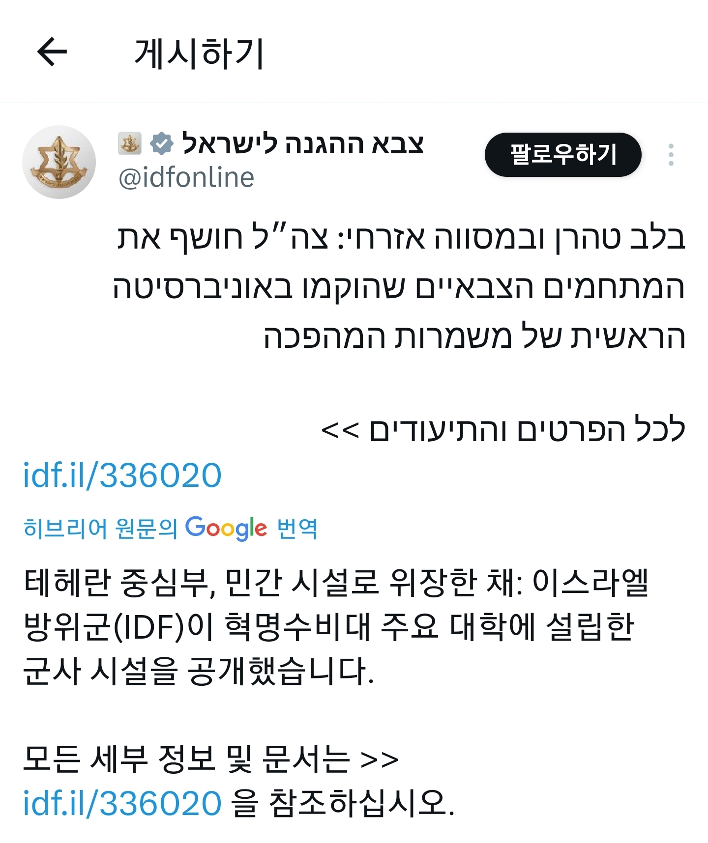 [[공포]]이스라엘군 = 이란 테헤란의 대학교를 정밀 타격했습니다. 대학교 내에 혁명수비대 군사시설이 있었습니다 작성자스타의일생|작성시간26.03.30|조회수1,693 목록 댓글 2 글자크기 작게가 글자크기 크게가 아무리 그래도 대학교를 폭격하면 어쩌냐 다음검색 현재 게시글 추가 기능 열기 북마크 공유하기 신고 센터로 신고 댓글 댓글 2 댓글쓰기 답글쓰기 댓글 리스트 작성자두바이쫀득고구마 | 작성시간 26.03.30 일단때리고 혁수대였다 그러는듯 작성자호튼 | 작성시간 26.03.31 근데 진짜 딱 그 건물먼 노려서 떄리는거 보면 신기하네.. 댓글 전체보기