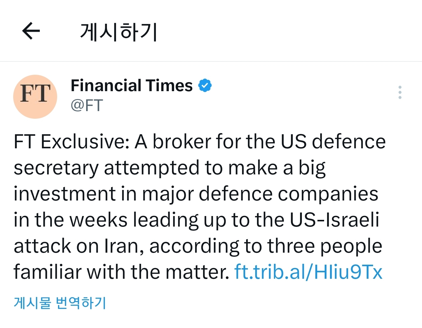 [[기타]][파이낸셜 타임즈] 미국 피터 헤그세스 전쟁부 장관 브로커가 이란 침공 직전 방산 업체에 대규모 투자를 시도했었음 작성자스타의일생|작성시간26.03.31|조회수842 목록 댓글 3 글자크기 작게가 글자크기 크게가 다음검색 현재 게시글 추가 기능 열기 북마크 공유하기 신고 센터로 신고 댓글 댓글 3 댓글쓰기 답글쓰기 댓글 리스트 작성자에이사 | 작성시간 26.03.31 개노답 미국 작성자짱 돌 | 작성시간 26.03.31 이딴게 지구 1등? 작성자꼭 잘 될거야 | 작성시간 26.03.31 지금 고아새끼 정부 인사들 다 그냥 한탕 해먹으려는 새끼 + 개병신새끼들 밖에 없는 것 같음 댓글 전체보기