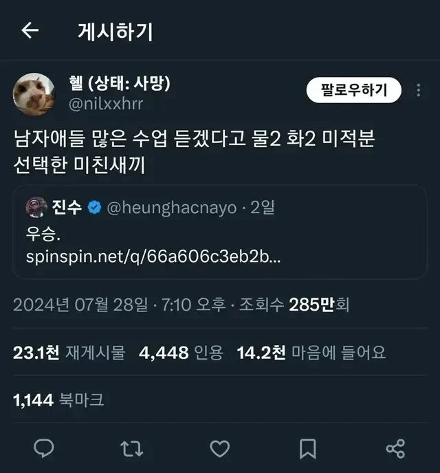 가짜 남미새와 진짜 남미새의 차이.jpg 작성자스키테일러s|작성시간26.03.31|조회수5,485 목록 댓글 7 글자크기 작게가 글자크기 크게가 가짜 진짜 다음검색 현재 게시글 추가 기능 열기 북마크 공유하기 신고 센터로 신고 댓글 댓글 7 댓글쓰기 답글쓰기 댓글 리스트 작성자까슈 | 작성시간 26.03.31 후자 뭐냐 진짜ㅋㅋㅋㅋㅋㅋㅋㅋㅋㅋㅋㅋㅋㅋㅋㅋ 작성자하녕 | 작성시간 26.03.31 와...ㅋㅋㅋㅋㅋㅋㅋㅋㅋㅋㅋㅋ 작성자북북벅벅 | 작성시간 26.03.31 물2 화2 ㅋㅋㅋㅋ 작성자흐헝흐헝 | 작성시간 26.03.31 미친ㅋㅋㅋㅋㅋㅋㅋ 작성자자유분방한 명수옹 | 작성시간 26.04.01 후자는 그냥 미친사람이잖ㅋㅋㅋ 댓글 전체보기