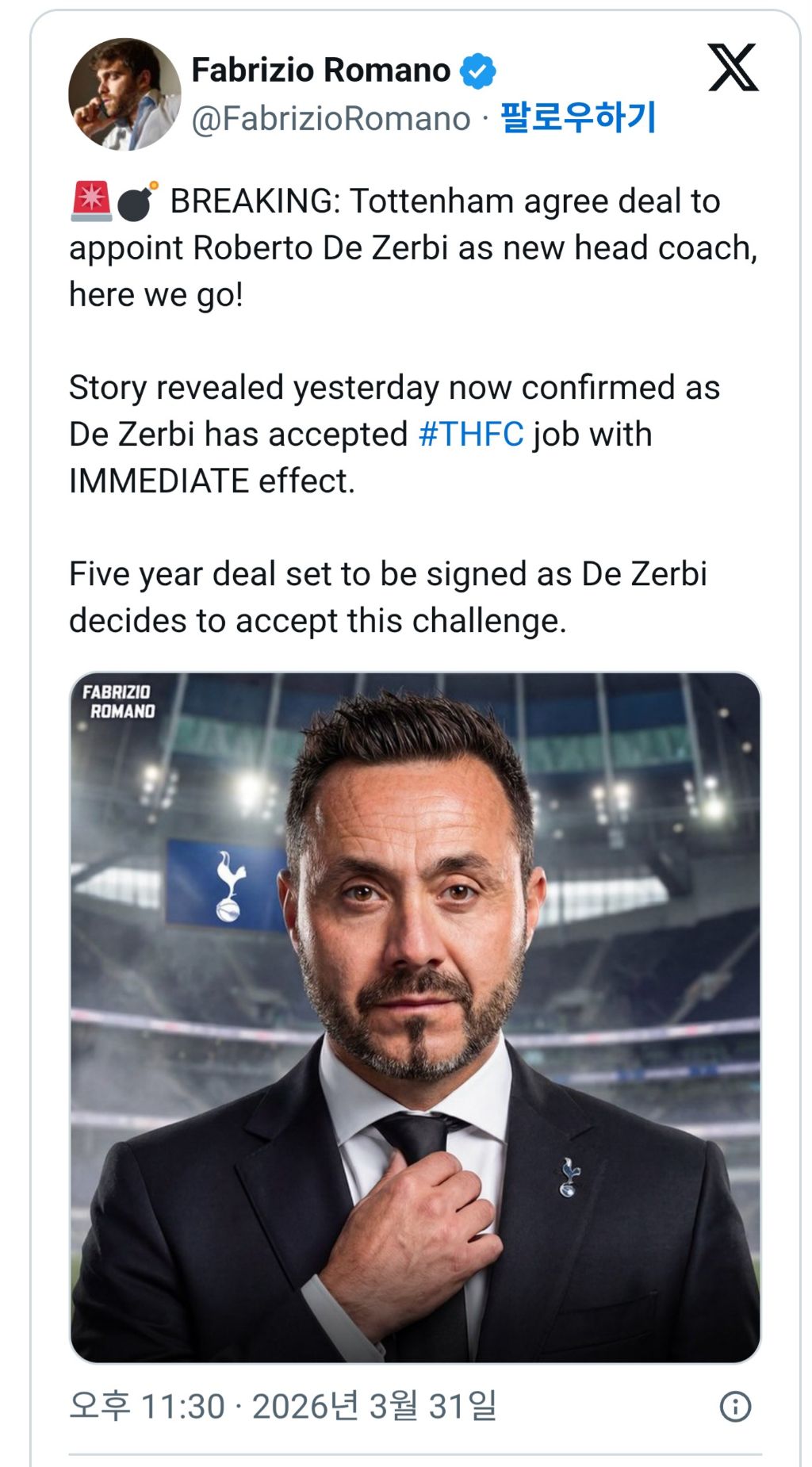 🚨💣 속보: 토트넘, 로베르토 데 제르비 신임 감독 선임에 합의