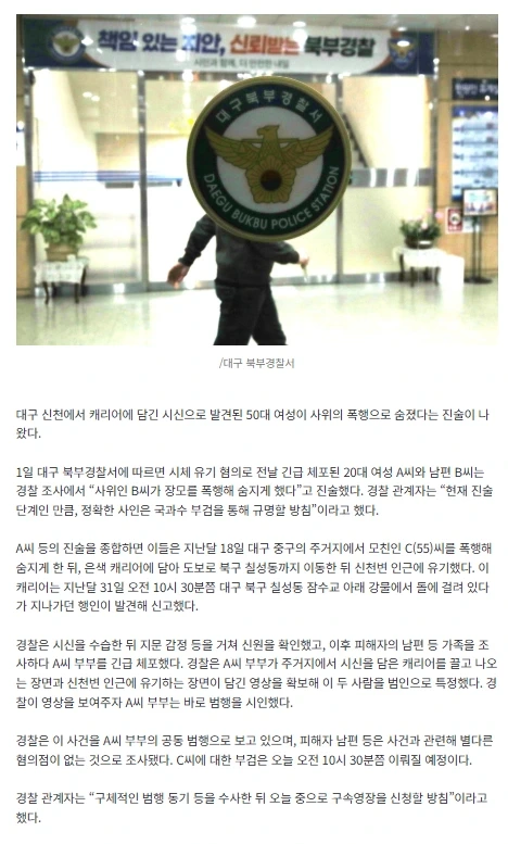대구 캐리어 사건 피의자 딸 부부 자백 '사위가 장모 폭행해 숨졌다' 작성자아르르르탁칵|작성시간26.04.01|조회수3,722 목록 댓글 10 글자크기 작게가 글자크기 크게가 “사위가 장모 폭행해 숨졌다”... 대구 캐리어 사건 피의자 딸 부부 자백“사위가 장모 폭행해 숨졌다”... 대구 캐리어 사건 피의자 딸 부부 자백대구 신천에서 캐리어에 담긴 시신으로 발견된 50대 여성이 사위의 폭행으로 숨졌다는 진술이 나왔다. 1일 대구 북부경찰서에 따르면 시체 유기 혐의로 전날 긴급 체포된 20대 여성 A씨와 남편 Bn.news.naver.com 다음검색 현재 게시글 추가 기능 열기 북마크 공유하기 신고 센터로 신고 댓글 댓글 10 댓글쓰기 답글쓰기 댓글 리스트 작성자서사무엘 | 작성시간 26.04.01 지 엄마 때려죽인 남자랑 시신유기를 공모를한다고? 맞나 ... 작성자방록바 | 작성시간 26.04.01 정신장애가 있는듯패륜짓도 토악질나지만유기한 장소가 사람들 운동하러 많이 가는곳임 작성자중요한 건 꺾이지 않는 마음 | 작성시간 26.04.01 ㄷㄷ 작성자첫째아들 | 작성시간 26.04.01 세상에나..... 작성자개굴리 | 작성시간 26.04.01 사형좀.. 댓글 전체보기