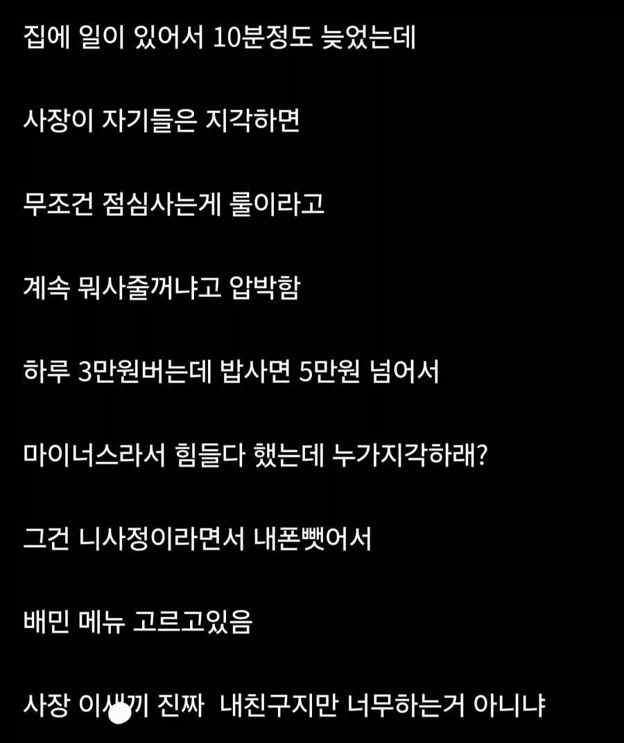 [스크랩] [[기타]]10분 늦은 알바에게 밥 얻어먹는 사장 작성자가면라이더 3|작성시간26.04.01|조회수15,199 목록 댓글 3 글자크기 작게가 글자크기 크게가 다음검색 스크랩 원문 : 樂soccer 현재 게시글 추가 기능 열기 북마크 공유하기 신고 센터로 신고 댓글 댓글 3 댓글쓰기 답글쓰기 댓글 리스트 작성자도를아시나요 | 작성시간 26.04.01 ㅋㅋ 나중에 월급받을때 다 다시줄듯 작성자니라 | 작성시간 26.04.01 근데 하루 3만원 벌면 친구여도 저렇게는 안할꺼같은디...ㅋㅋ머 다른 사정이 있겠지 작성자안하는것과못하는것은엄연히다르지요 | 작성시간 26.04.01 요즘 유행하는 선 존나 넘는데 지혼자유쾌한척하는 늙은 찐따구나 댓글 전체보기