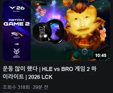 [[LOL]]개막전부터 고소먹을거같은 LCK 썸네일러 작성자스키테일러s|작성시간26.04.01|조회수3,479 목록 댓글 1 글자크기 작게가 글자크기 크게가 일단 청계산 가자 다음검색 현재 게시글 추가 기능 열기 북마크 공유하기 신고 센터로 신고 댓글 댓글 1 댓글쓰기 답글쓰기 댓글 리스트 작성자Faraday | 작성시간 26.04.01 ㅋㅋㅋㅋㅋ 댓글 전체보기