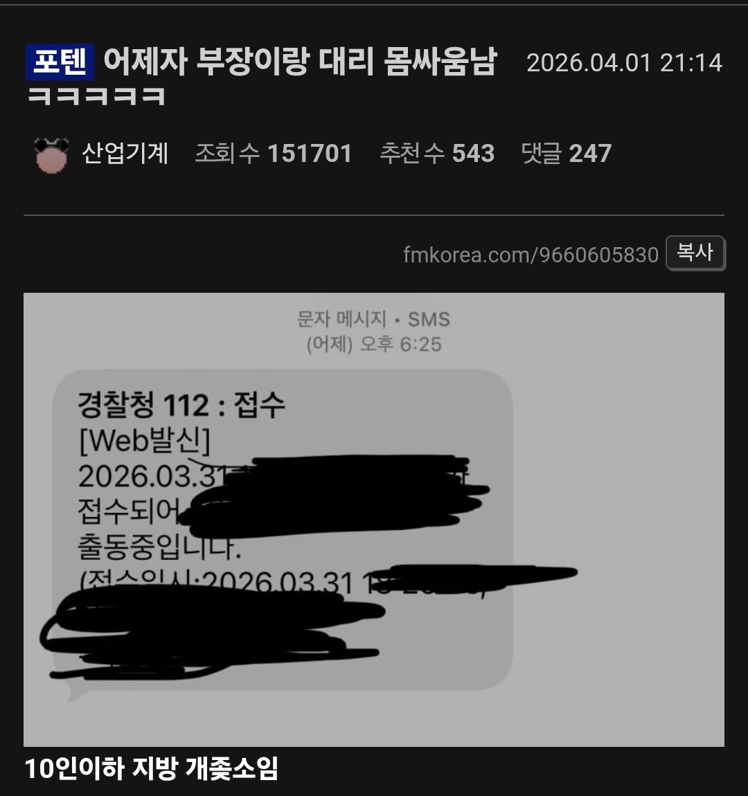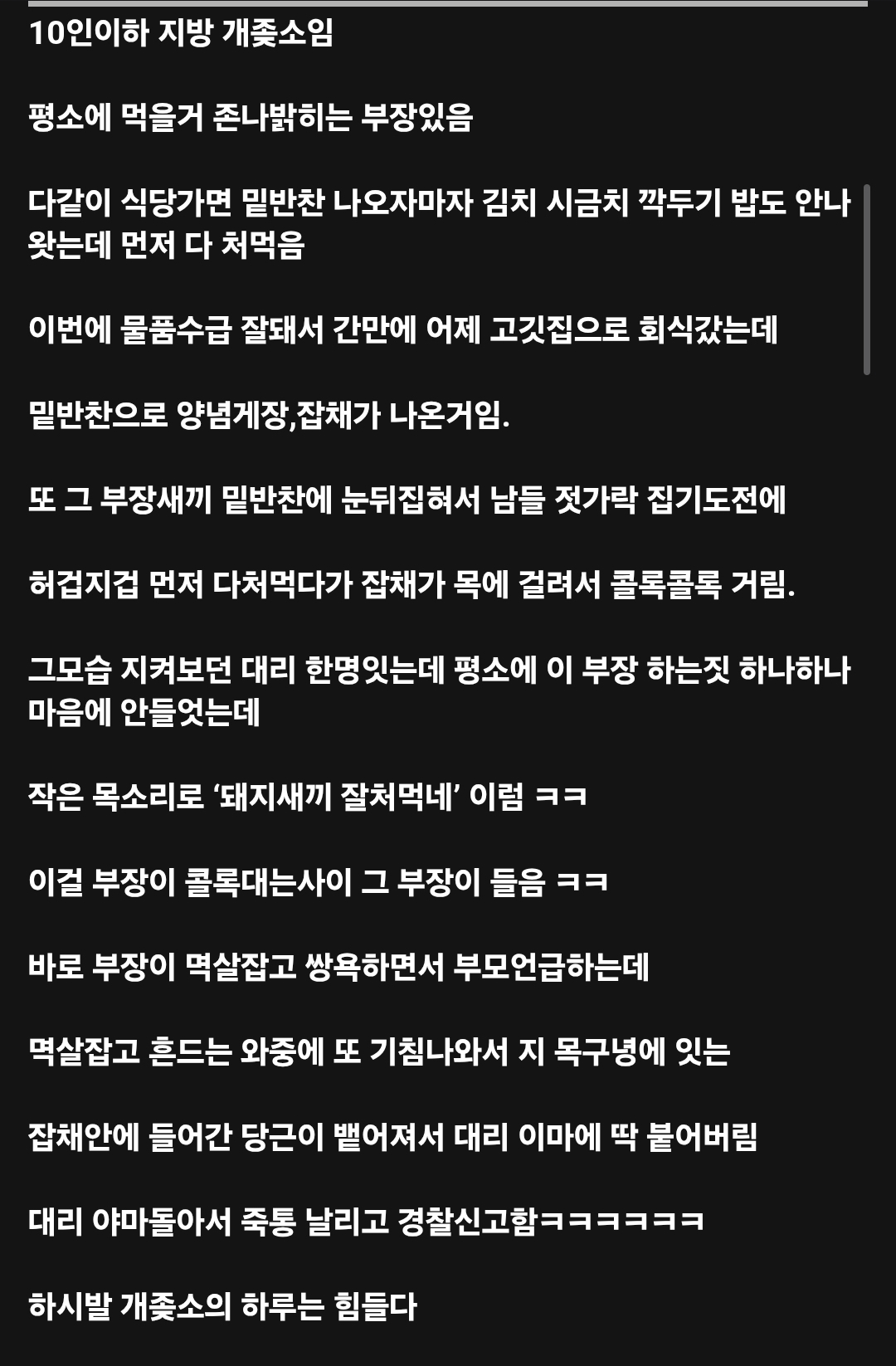 어제 부장이랑 대리 맞짱깠다 작성자스키테일러s|작성시간26.04.01|조회수4,930 목록 댓글 3 글자크기 작게가 글자크기 크게가 다음검색 현재 게시글 추가 기능 열기 북마크 공유하기 신고 센터로 신고 댓글 댓글 3 댓글쓰기 답글쓰기 댓글 리스트 작성자sleeping | 작성시간 26.04.01 스펙타클하네 작성자C-Dog | 작성시간 26.04.01 ㅋㅋ 작성자미사리백수 | 작성시간 26.04.02 하.. 진짜 저도 차장놈 밥 백정같이 처먹어서 겸상하기 싫음다 처먹을거 같이 생겼으면서 음식도 가리는거 많아서 더 짜증남 댓글 전체보기