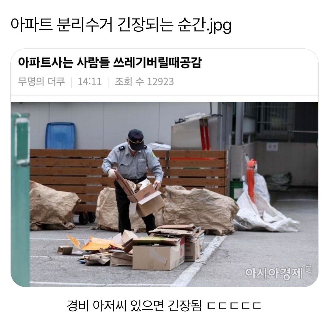 아파트 분리수거 긴장되는 순간 작성자날마다구하라|작성시간26.04.02|조회수10,719 목록 댓글 3 글자크기 작게가 글자크기 크게가 다음검색 현재 게시글 추가 기능 열기 북마크 공유하기 신고 센터로 신고 댓글 댓글 3 댓글쓰기 답글쓰기 댓글 리스트 작성자케이플립 | 작성시간 26.04.02 박스 대충 두고 가시라고 본인이 정리한다고 친절하게 웃으면서 얘기하시는데묘하게 긴장 되긴함 ㅋㅋ 작성자빌리헤링턴 | 작성시간 26.04.02 경비 아저씨들마다 워낙 케바케가 심해서 ㄷㄷ 작성자된꾸앙 | 작성시간 26.04.02 군대 분리수거장에서 빠꾸먹은기억이... 댓글 전체보기