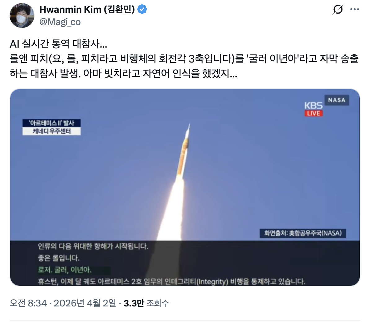 [스크랩] 실시간 AI 통역 대참사 작성자+ Der.Langrisser +|작성시간26.04.02|조회수5,556 목록 댓글 15 글자크기 작게가 글자크기 크게가 다음검색 스크랩 원문 : 이종격투기 현재 게시글 추가 기능 열기 북마크 공유하기 신고 센터로 신고 댓글 댓글 15 댓글쓰기 답글쓰기 댓글 리스트 작성자300표가진분 | 작성시간 26.04.02 ㅋㅋㅋㅋㅋ 작성자전기쌍기사 | 작성시간 26.04.02 로저 이년아~~ 작성자개차반 | 작성시간 26.04.02 아르테미스를 비취! 로 만들고 싶었나보자 작성자젤라또 | 작성시간 26.04.02 이뇨니ㅋㅋ 작성자실용글쓰기 | 작성시간 26.04.02 사과엔딩 이미지 확대 댓글 전체보기
