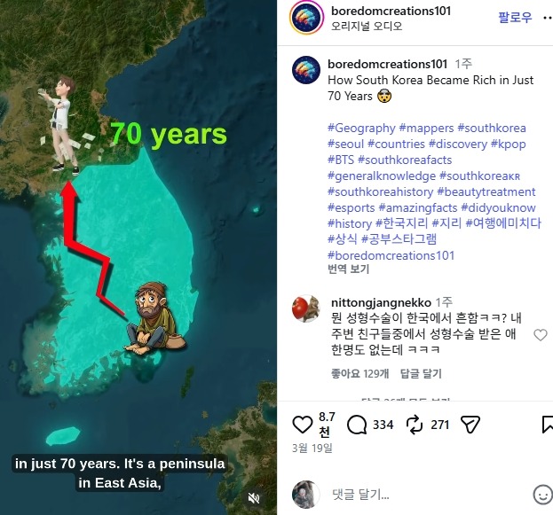 한국이 정말 자랑스럽다. 한국 전쟁 이후 온갖 고난을 다 겪고도 회복 탄력성, 결단력, 성실함, 그리고 노력을 통해 가장 성공하고 강한 나라 중 하나가 됐잖아.