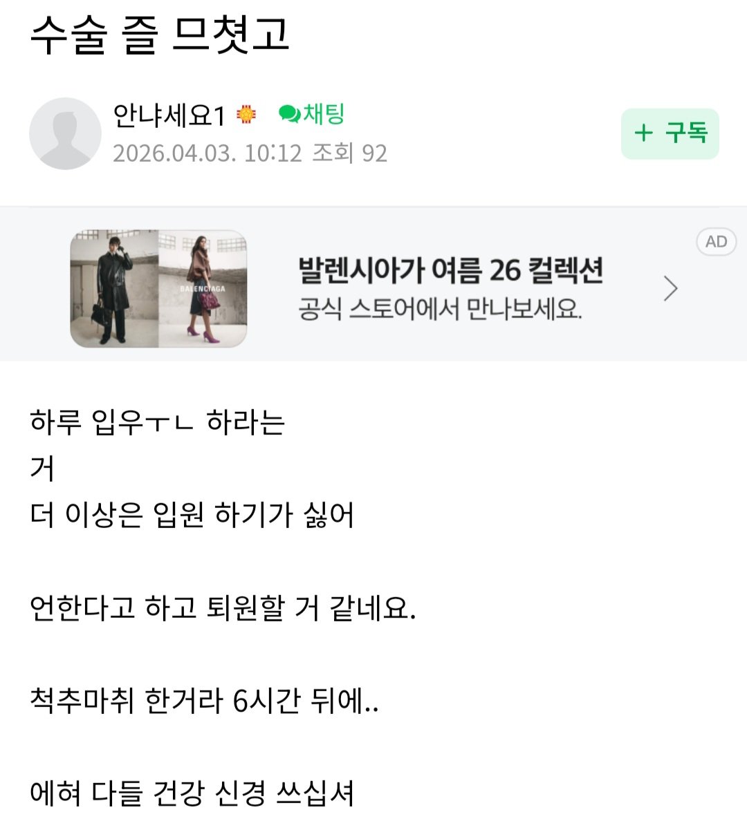 작성자금욕중 작성시간 26.04.03 똥꼬수술하고 당일퇴원한거 엄청후회했음 자는데 똥꼬한번움찔하니 찢어지는느낌나는데 트라우마때문인지 5분에 한번씩 나도모르게 계속움찔움찔거려서 진짜 잠을못잠 무통주사꼽고있었어야하는데