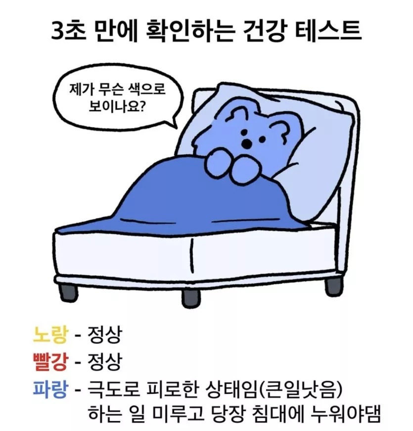 3초 만에 확인하는 현재 건강상태 작성자랜서의마음|작성시간26.04.06|조회수58,922 목록 댓글 14 글자크기 작게가 글자크기 크게가 다음검색 현재 게시글 추가 기능 열기 북마크 공유하기 신고 센터로 신고 댓글 댓글 14 댓글쓰기 답글쓰기 댓글 리스트 작성자오트밀존맛 | 작성시간 26.04.06 파랑이 좋겠군 작성자바람부는언덕 | 작성시간 26.04.07 어 보라색은 뭐죠? 작성자태쉬기 | 작성시간 26.04.07 노랑이나 빨강이 됨??? 작성자야근없는회사생활 | 작성시간 26.04.07 4시간도 못잠... 작성자카피바라 | 작성시간 26.04.07 아 미뤄야겠네 쉬자 댓글 전체보기