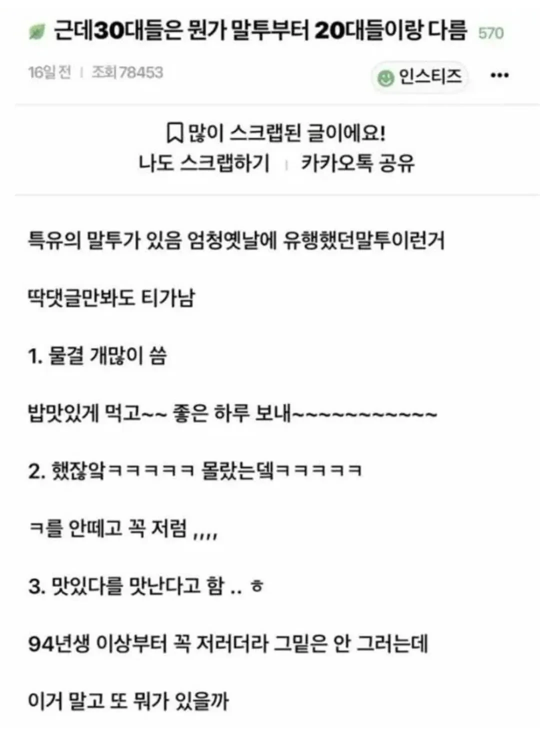 30대는 말투부터 다름 작성자헤이즈 heize|작성시간26.04.06|조회수30,390 목록 댓글 15 글자크기 작게가 글자크기 크게가 아닌뎈~~~~~~ㅋㅋㅋㅋ,,,ㅎ 다음검색 현재 게시글 추가 기능 열기 북마크 공유하기 신고 센터로 신고 댓글 댓글 15 댓글쓰기 답글쓰기 댓글 리스트 작성자박지성 | 작성시간 26.04.06 ㅎㅎㅎ.. 작성자좋은데이 | 작성시간 26.04.06 >_< 작성자vans | 작성시간 26.04.07 어이 학생 글내려~~~ 작성자나으실수 | 작성시간 26.04.07 ~~~~~~~~~~~~~~~~~~퉤 작성자융융이다 | 작성시간 26.04.07 아닌뎈ㅋㅋㅋㅋㅋㅋㅋ 댓글 맛난다~~~~~ 댓글 전체보기