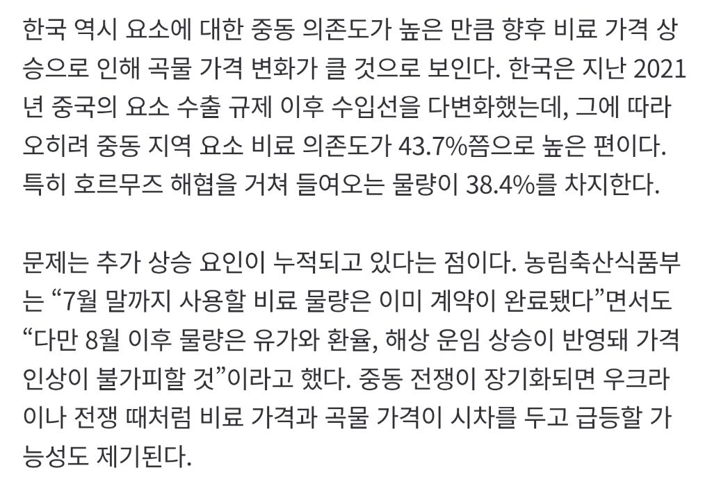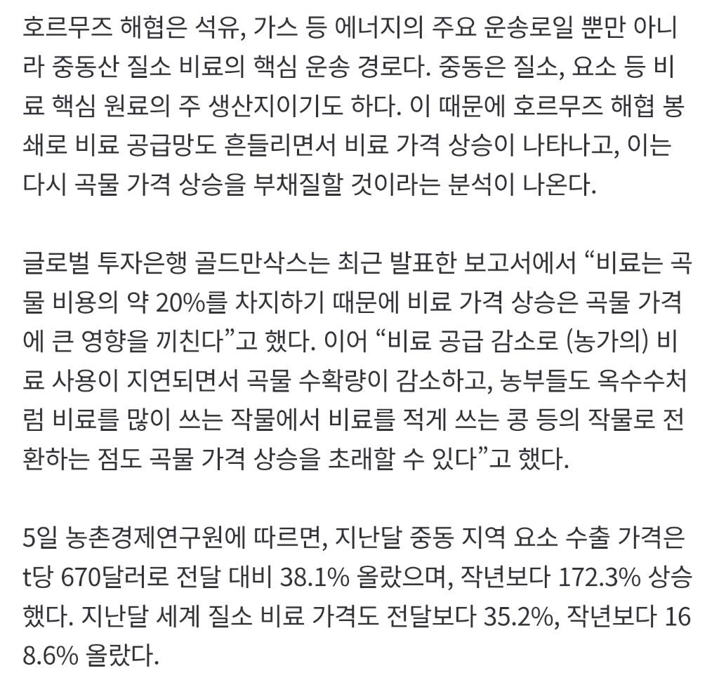 [[뉴스]]중동 요소가격 1년만에 172% 폭등… 국내 요소 비료 절반가량이 중동산 작성자Miyeon|작성시간26.04.07|조회수9,612 목록 댓글 1 글자크기 작게가 글자크기 크게가 중략https://n.news.naver.com/article/023/0003969036?sid=101중동 요소가격 1년만에 172% 폭등… 국내 요소 비료 절반가량이 중동산정부 “8월부터 가격 인상 불가피” 호르무즈 해협은 석유, 가스 등 에너지의 주요 운송로일 뿐만 아니라 중동산 질소 비료의 핵심 운송 경로다. 중동은 질소, 요소 등 비료 핵심 원료의 주 생산n.news.naver.com 다음검색 현재 게시글 추가 기능 열기 북마크 공유하기 신고 센터로 신고 댓글 댓글 1 댓글쓰기 답글쓰기 댓글 리스트 관리자에 의해 규제된 글입니다. 댓글 전체보기