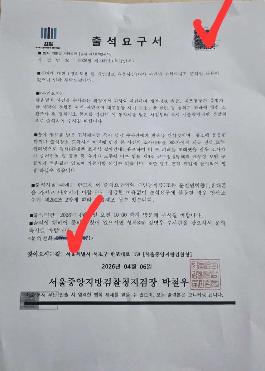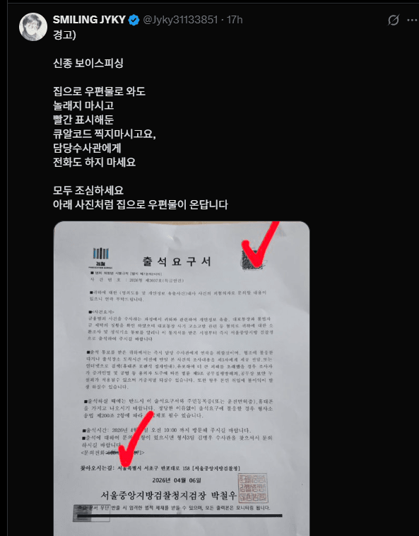 보이스피싱 수법 근황 작성자내꿈은롯데우승보ㄱI|작성시간26.04.07|조회수17,924 목록 댓글 18 글자크기 작게가 글자크기 크게가 이젠 진짜 등기로 보내서 사기침 다음검색 현재 게시글 추가 기능 열기 북마크 공유하기 신고 센터로 신고 댓글 댓글 18 댓글쓰기 답글쓰기 댓글 리스트 작성자racket | 작성시간 26.04.07 우편물이면 보낸이 추적 가능하지 않을까 꼭 잡았으면.. 작성자딴따0 | 작성시간 26.04.07 이런건 진짜 본보기를 보여줘야하는데.. 작성자지나가던곰 | 작성시간 26.04.07 사건번호 검색해봐야겠네 작성자Hacker | 작성시간 26.04.08 공문위조 쌔지않나 작성자내사랑둘리 | 작성시간 26.04.09 법원 등기는 직접 전달이 원칙 아닌가? 댓글 전체보기