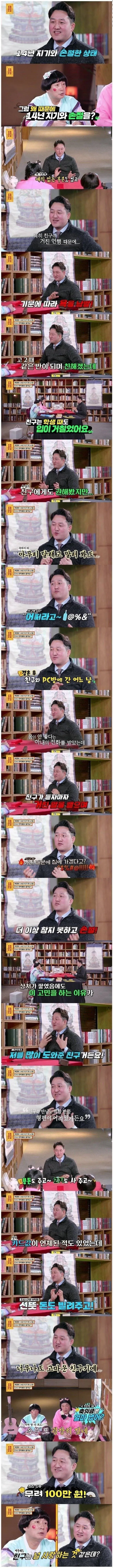14년 지기 친구와 손절 고민 중이라는 남자 작성자우주소녀보나|작성시간26.04.08|조회수14,318 목록 댓글 3 글자크기 작게가 글자크기 크게가 다음검색 현재 게시글 추가 기능 열기 북마크 공유하기 신고 센터로 신고 댓글 댓글 3 댓글쓰기 답글쓰기 댓글 리스트 작성자GO YOON JEONG | 작성시간 26.04.08 금전적으로 신세진거 있었으면 다 갚고 손절할듯막말하는것도 인성 안좋은건데 왜 굳이 참고가야됨? 작성자MaDoll | 작성시간 26.04.08 친구가 날욕하는건 참지만 가족관련된거 욕하면 못참긴하지..방송이라 걸러서 말한거겟지.. 남자대 남자로 봣을떄 친구가 욕을 많이에서 손절하고싶다는건 선넘은적 많다는거 답댓글 작성자아무의미없는닉네임 | 작성시간 26.04.08 ㄹㅇ 댓글 전체보기