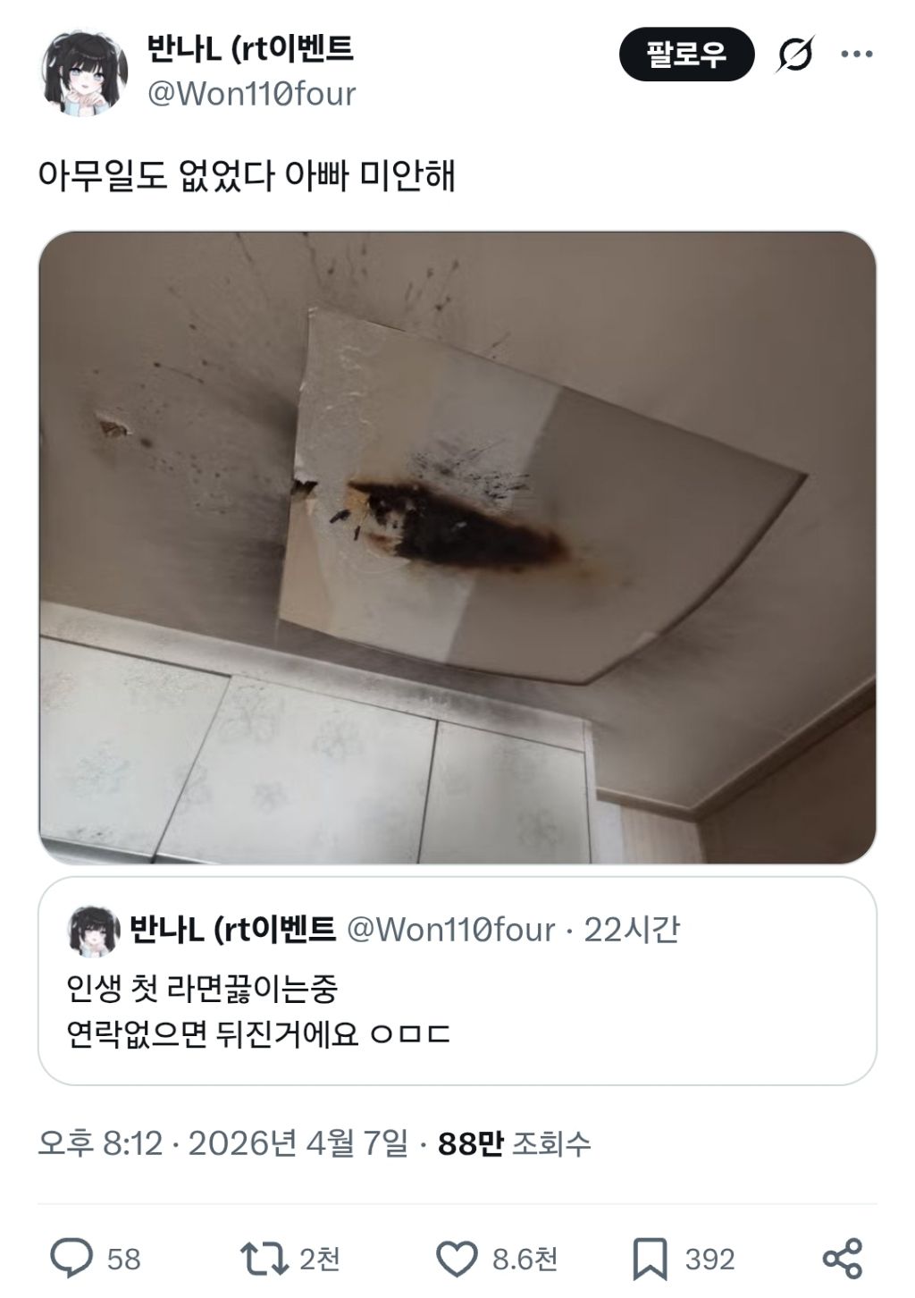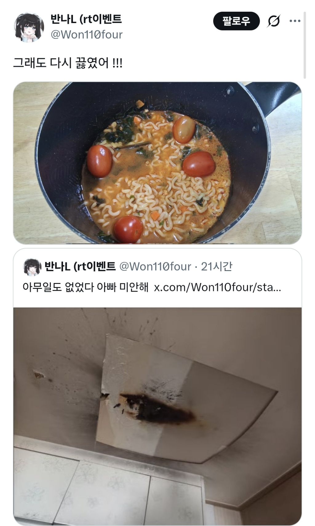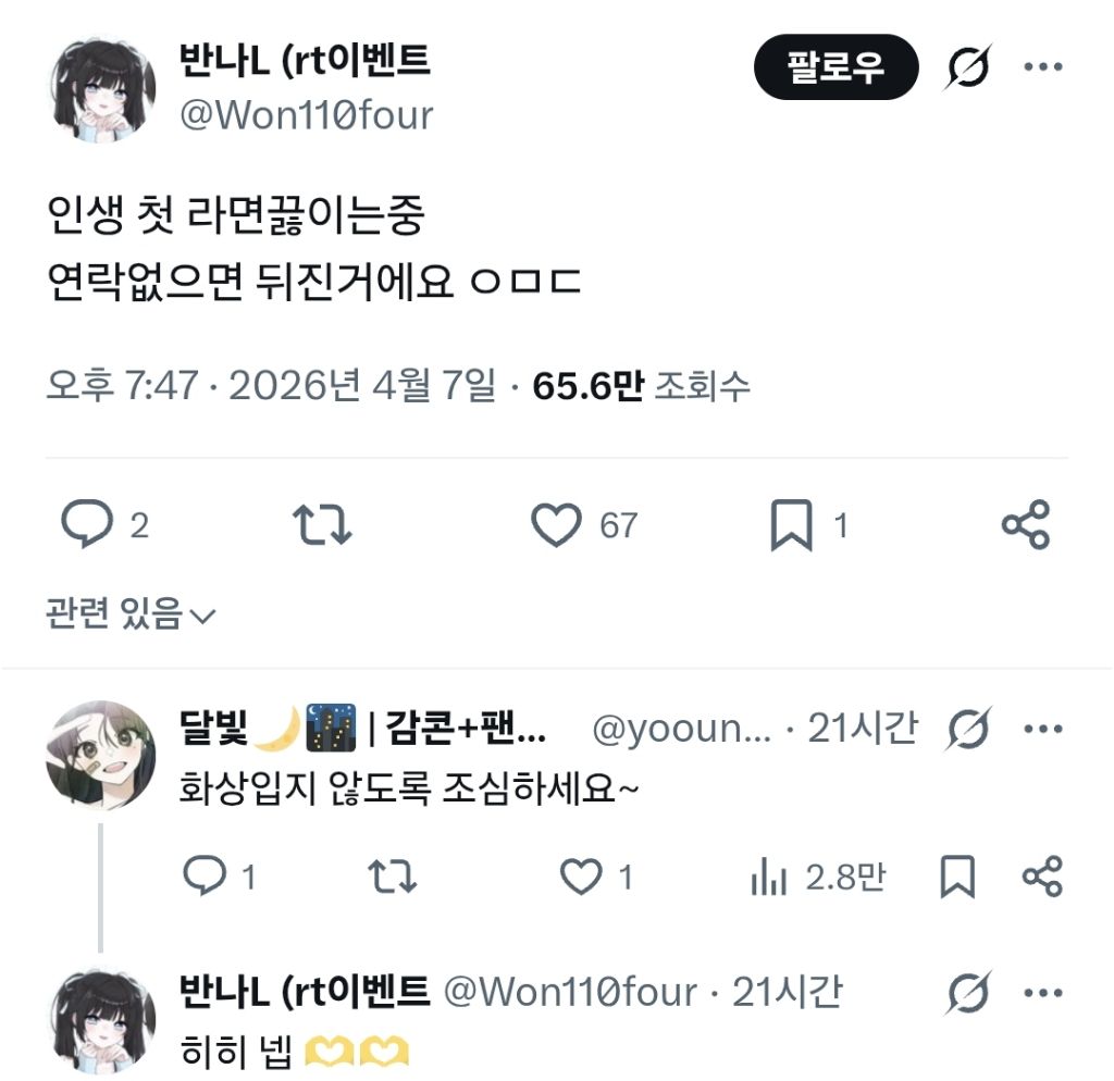 작성시간 26.04.09 평범한 트짹이들의 심리를 알아야 저 글을 이해할 수 있음 라면을 끓이기 전 글을 써야지! 이게 아니고 저 사진을 구했거나 원래부터 있거나한 사진을 보고 오호라! 저걸로 어그로 끌어야지! 하고 지가 스토리를 만드는거지