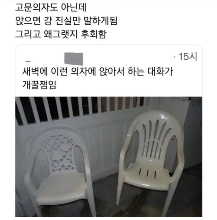진실만을 말하게 되는 의자 작성자83기동대|작성시간26.04.08|조회수2,602 목록 댓글 3 글자크기 작게가 글자크기 크게가 다음검색 현재 게시글 추가 기능 열기 북마크 공유하기 신고 센터로 신고 댓글 댓글 3 댓글쓰기 답글쓰기 댓글 리스트 작성자요염 | 작성시간 26.04.08 ㅋㅋㅋ 작성자Sheldon | 작성시간 26.04.08 파란색 빨간색 의자면 효과가 더 강력해지는 느낌임 작성자흰표범 | 작성시간 26.04.09 드르륵 칵 댓글 전체보기