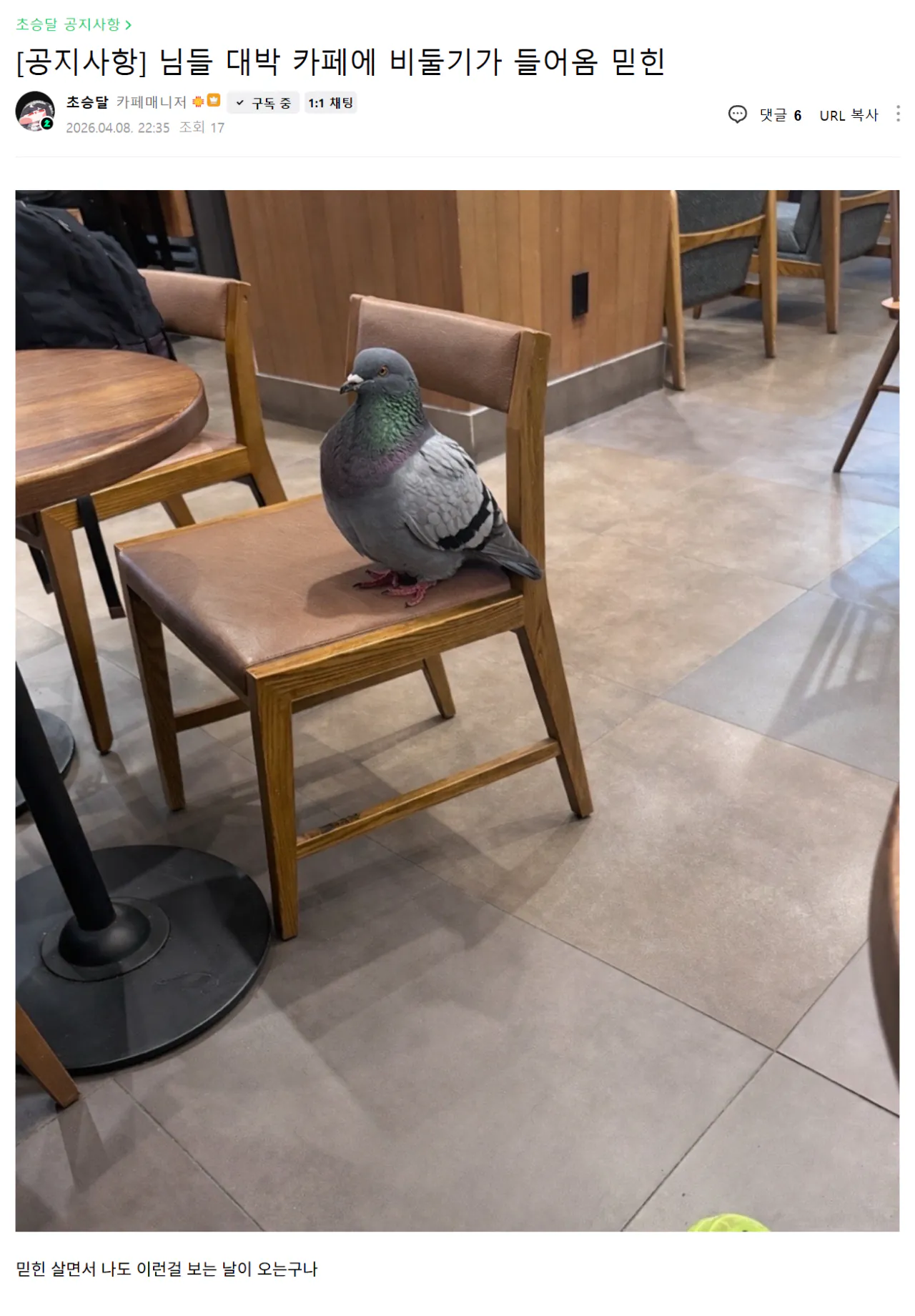 카페에 등장한 비둘기 작성자스키테일러s|작성시간26.04.08|조회수15,640 목록 댓글 6 글자크기 작게가 글자크기 크게가 출처:스트리머 초승달카페 다음검색 현재 게시글 추가 기능 열기 북마크 공유하기 신고 센터로 신고 댓글 댓글 6 댓글쓰기 답글쓰기 댓글 리스트 답댓글 작성자지토 선생 | 작성시간 26.04.08 사이즈가 피존원 정도 될듯요 작성자핫독핫독핫디기리독 | 작성시간 26.04.08 줜나 크네 ;; 작성자NIKEMAN | 작성시간 26.04.08 개크네 ㅋㅋㅋ 작성자푸른밤 종현입니다 | 작성시간 26.04.09 왜케커무섭다 작성자먀몸미 | 작성시간 26.04.09 어떻게 의자에 저렇게 앉아있어 ㅋㅋㅋㅋㅋㅋㅋㅋㅋ 댓글 전체보기