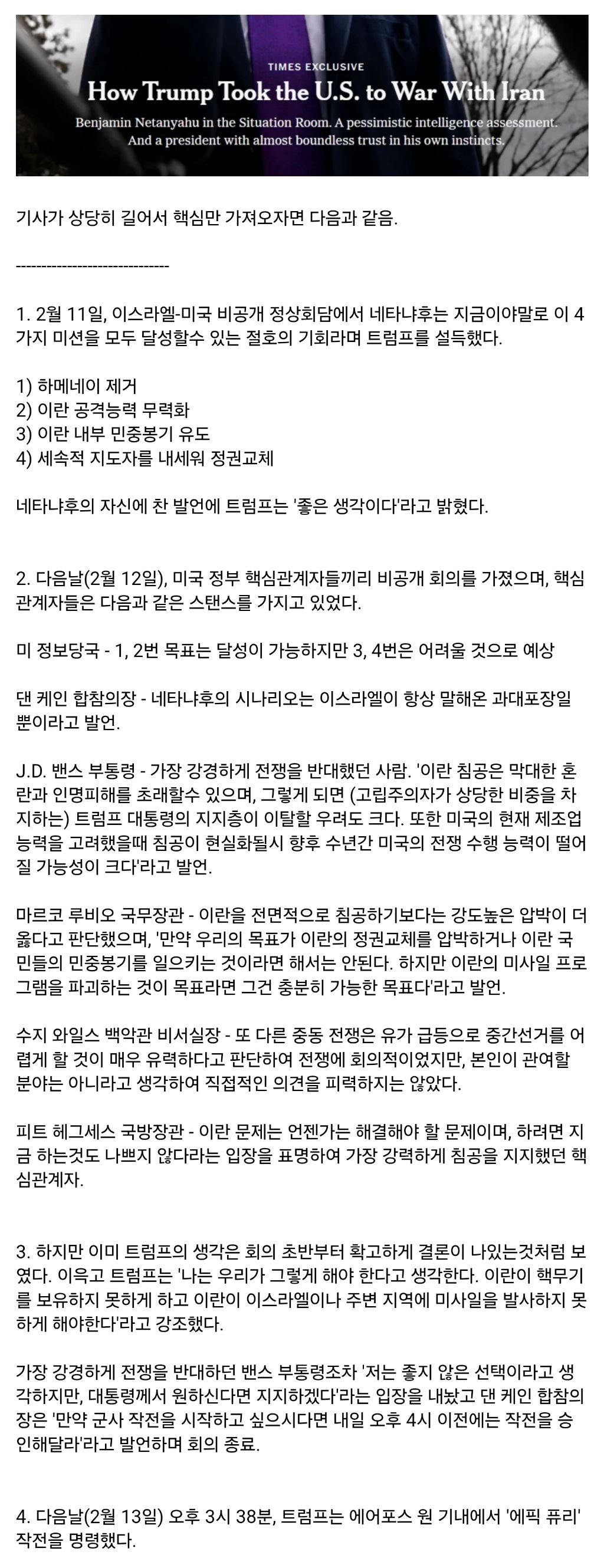 [뉴욕 타임즈] 트럼프는 어떻게 이란과 전쟁을 시작하게 됐는가 작성자켄틸레버|작성시간26.04.09|조회수2,177 목록 댓글 7 글자크기 작게가 글자크기 크게가 https://www.nytimes.com/2026/04/07/us/politics/trump-iran-war.html펨코 펌 다음검색 현재 게시글 추가 기능 열기 북마크 공유하기 신고 센터로 신고 댓글 댓글 7 댓글쓰기 답글쓰기 댓글 리스트 작성자누렁누렁이 | 작성시간 26.04.09 네재앙 ㄷ 작성자이지모 | 작성시간 26.04.09 에휴시바 따까리새끼 작성자나 따위가 무슨. | 작성시간 26.04.09 레전드네 작성자C-Dog | 작성시간 26.04.09 저랬는데 실패하면 밴스탓이라고 한거?ㅋㅋㅋ 작성자후추 | 작성시간 26.04.09 헤그세스 전쟁광자식 댓글 전체보기