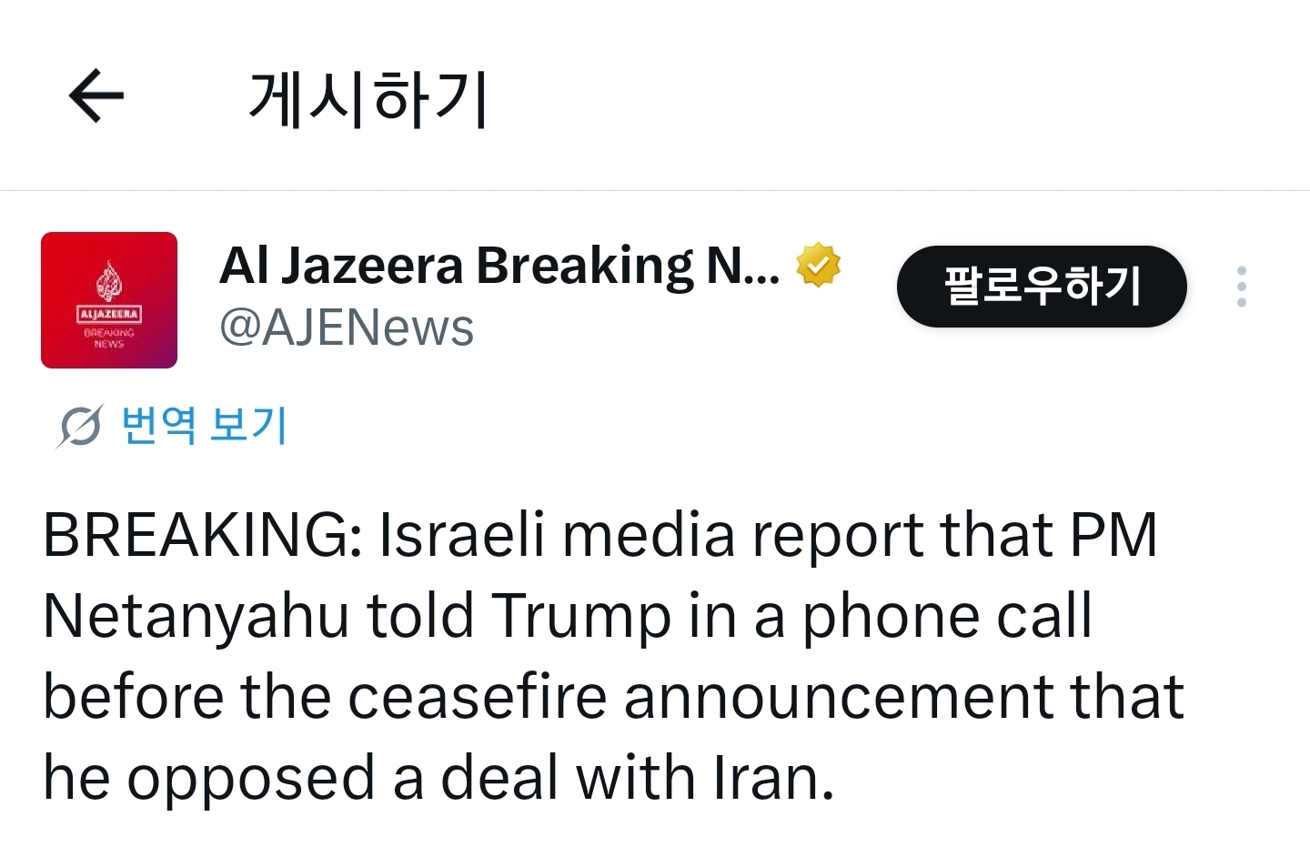 [[개솔ㅅㄱ]]어제 휴전 직전, 이스라엘 네타냐후 총리는 트럼프 대통령에게 반대 입장을 전했었습니다. 작성자스타의일생|작성시간26.04.09|조회수2,061 목록 댓글 8 글자크기 작게가 글자크기 크게가 다음검색 현재 게시글 추가 기능 열기 북마크 공유하기 신고 센터로 신고 댓글 댓글 8 댓글쓰기 답글쓰기 댓글 리스트 작성자꼬꼬리몽 | 작성시간 26.04.09 new 생긴것도 ㅈ같이 생긴게 ㅈ같은짓만 골라서 하네ㅋ 작성자흠냐륑.... | 작성시간 26.04.09 new ㅋㅋㅋ진짜 싸이코네 작성자로얄이랑 젤리랑 | 작성시간 26.04.09 new 미친새끼임?? 작성자팔닭 | 작성시간 26.04.09 new 휴전하면 비리로 거의 높은 확률로 감방가서 끝까지 발악하는듯 작성자하피 | 작성시간 26.04.09 new 얘는 전쟁끝나면 바로 감옥행이라 이럴수밖에없음 댓글 전체보기