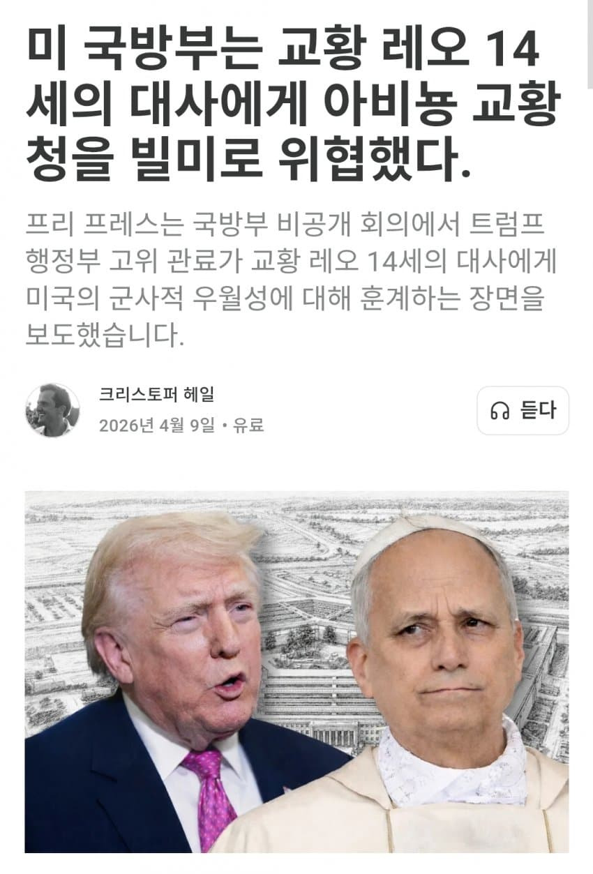 정확히는 미 국방부 차관인 엘브리지 콜비가 주미 교황청 대사인 크리스토프 피에르 추기경을 호출해서 중세 아비뇽 유수를 언급하는 동시에, 미국 편에 서는게 좋을거라고 군사력으로 위협했다고함...